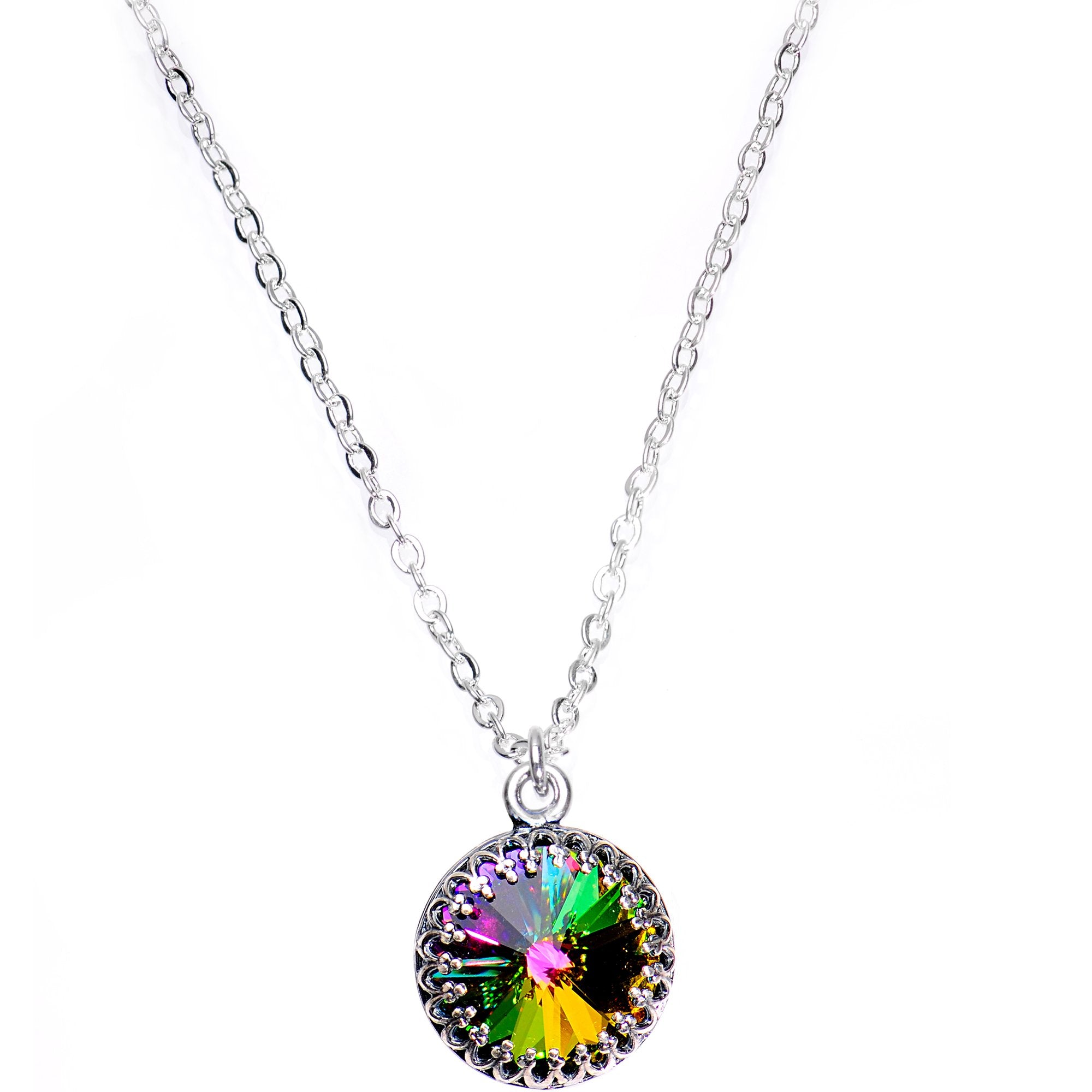 This awesome handmade necklace features a bombastic, rainbow-colored crystal. The rainbow-tinted crystal is framed by an intricate metalwork design. The crystal charm hangs from an 18" silver plated cable chain featuring a lobster clasp closure. Handcrafted in the USA.