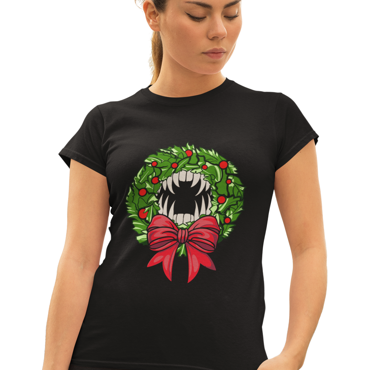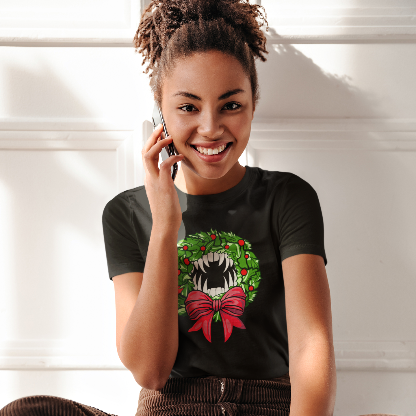 Picture this: a comfortable, breathable tee crafted from premium 100% cotton, featuring an exclusive artist-drawn Holiday Vampire Wreath that is sure to steal the spotlight at any gathering.