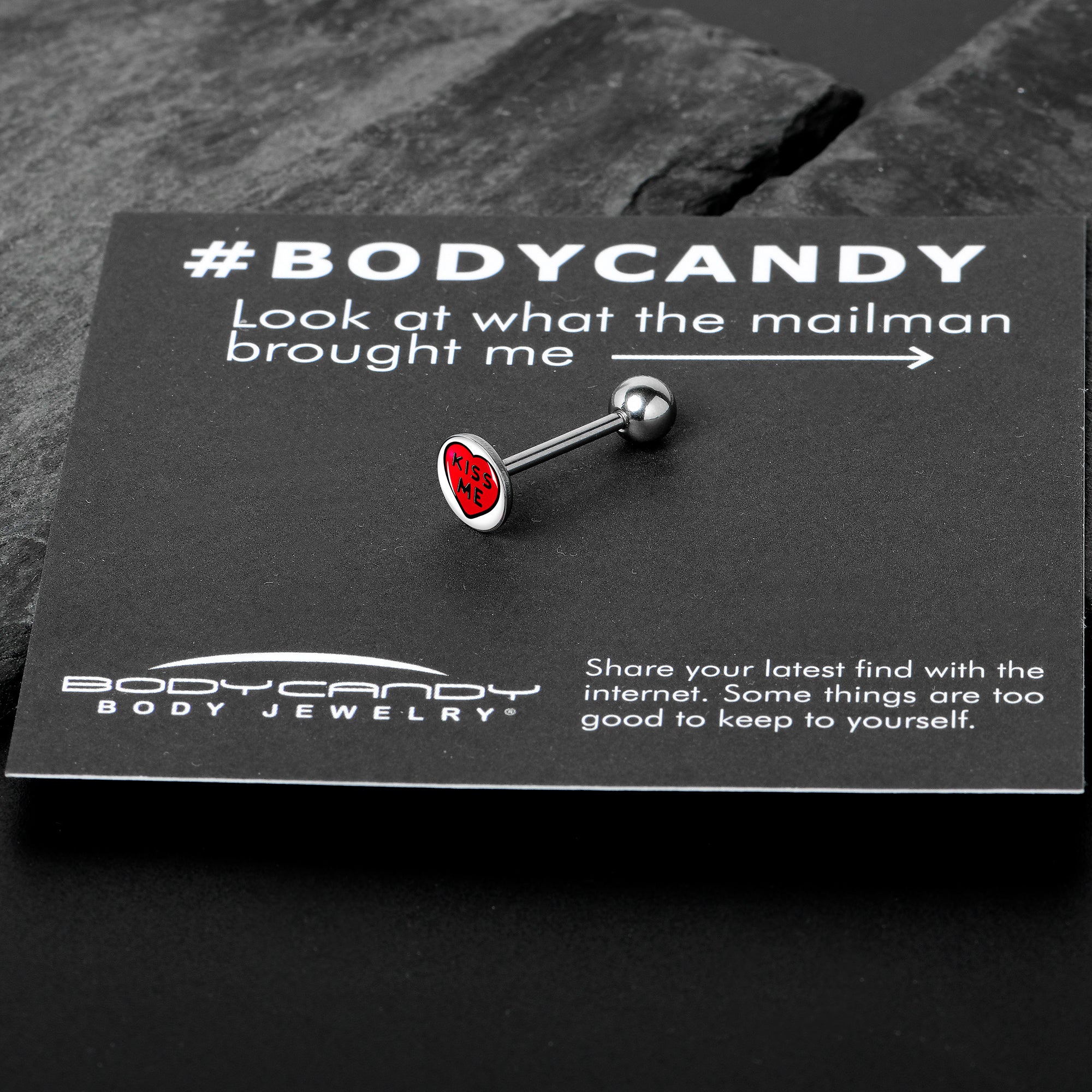 Hypoallergenic jewelry for sensitive skin.Kiss Me Candy Heart Barbell Tongue Ring