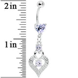 Give your self the royal treatment, with this princess worthy heart belly ring. Dangle navel ring with heart shaped gem and detailed heart dangle. Curved barbell belly jewelry with prong set gem.