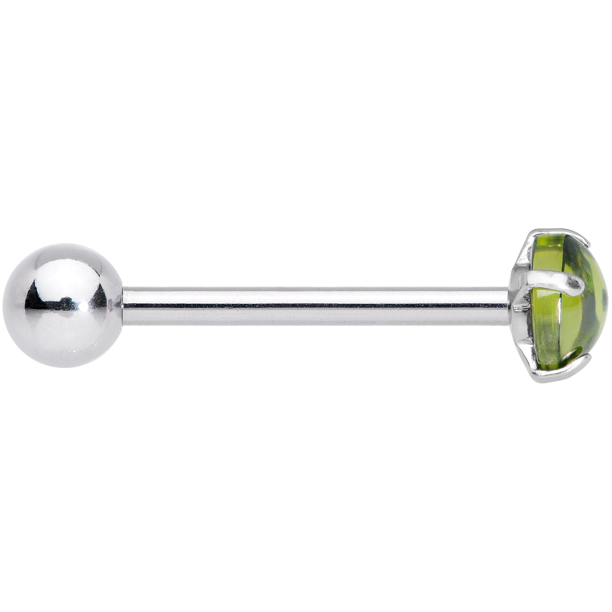 Add some color to your words with this 14 gauge tongue jewelry! It's made with a 5/8" durable 316L surgical grade stainless steel straight barbell with a 5mm bottom ball end. The top end features a smooth light green cubic zirconia gem for a stylish look and a comfortable feel. Your tongue piercing deserves a little luxury too so give it some with this gorgeous and glamorous barbell jewelry!