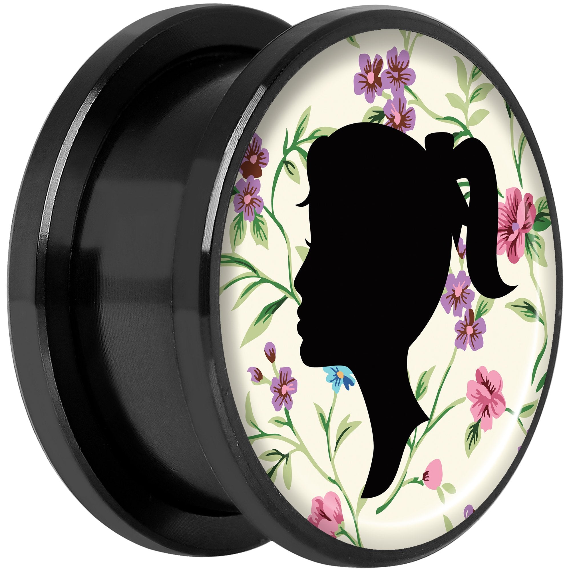 If you love floral prints and classic male and female silhouettes then this pair of double flare plugs is right for you! Made with black anodized over 316L surgical grade stainless steel, these 11/16" ear gauges are made with a screw fit design for easier insertion and removal and are sold as a set of two for you.