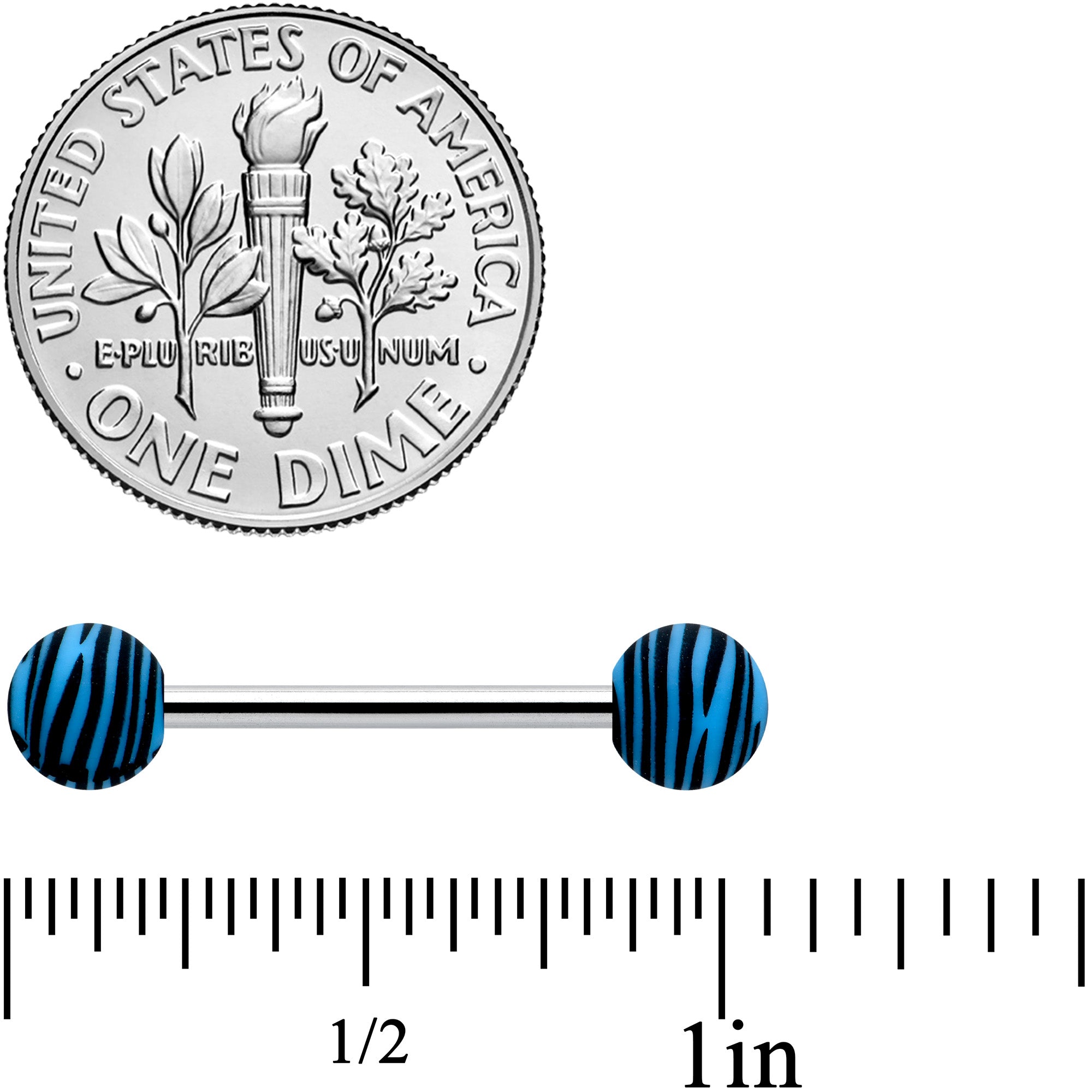 Add some zany zebra style to your look with this 14 gauge tongue jewelry! It's made with a 5/8" durable 316L surgical grade stainless steel straight barbell with 5mm ball ends. The ball ends are made with acrylic and feature a blue and black zebra-striped pattern. They also feature a matte finish for a look that stands out without overwhelming. You'll definitely love the look of this tongue piercing jewelry!