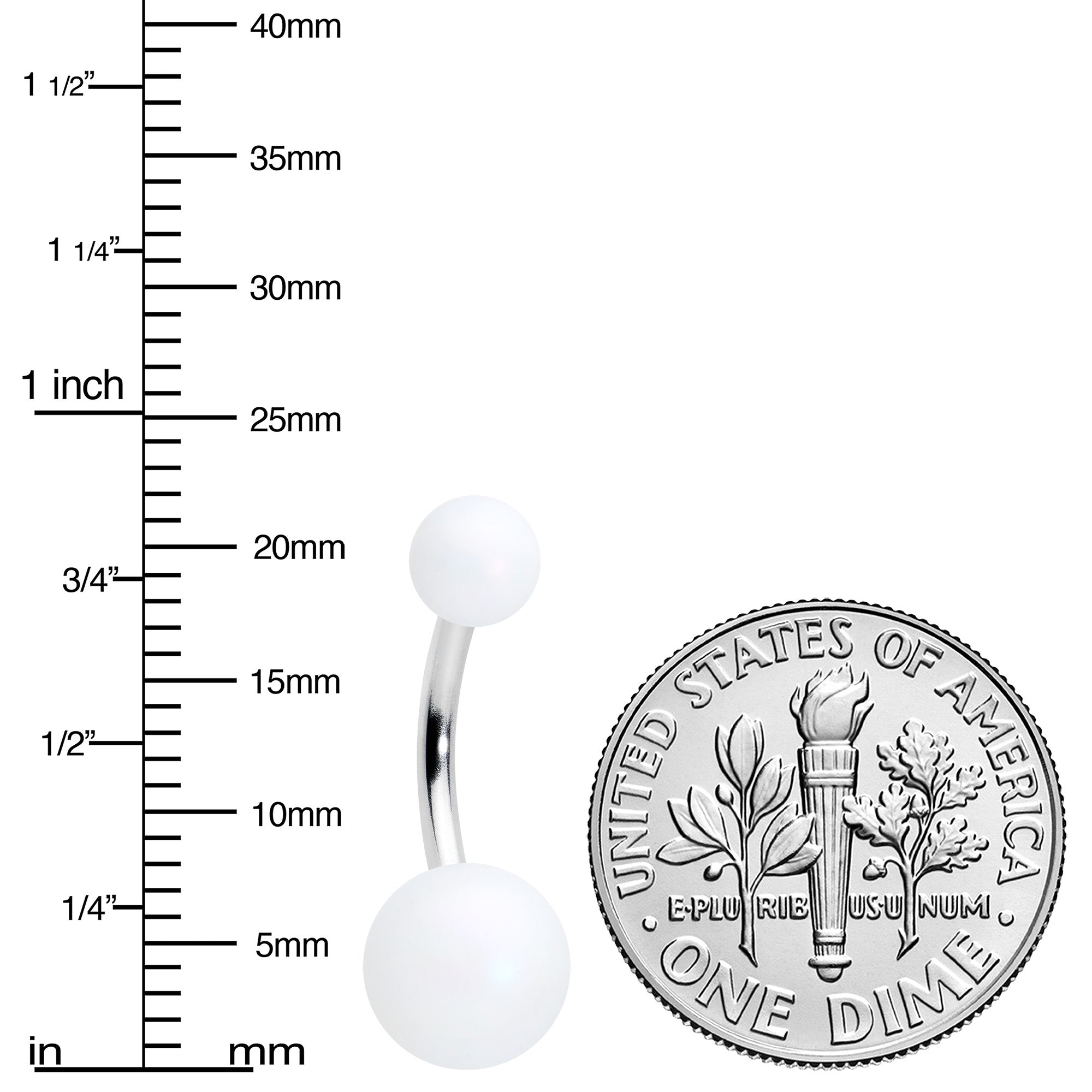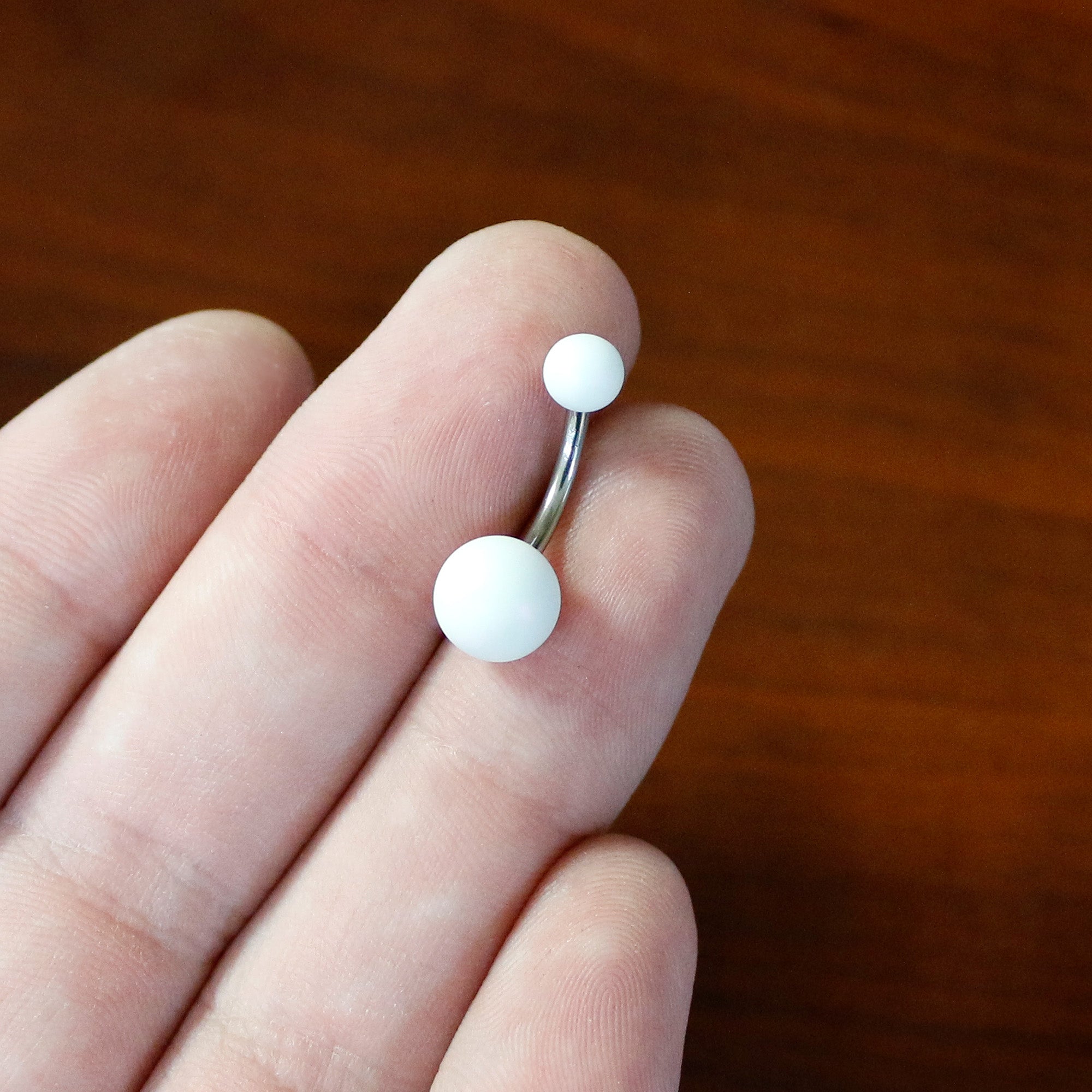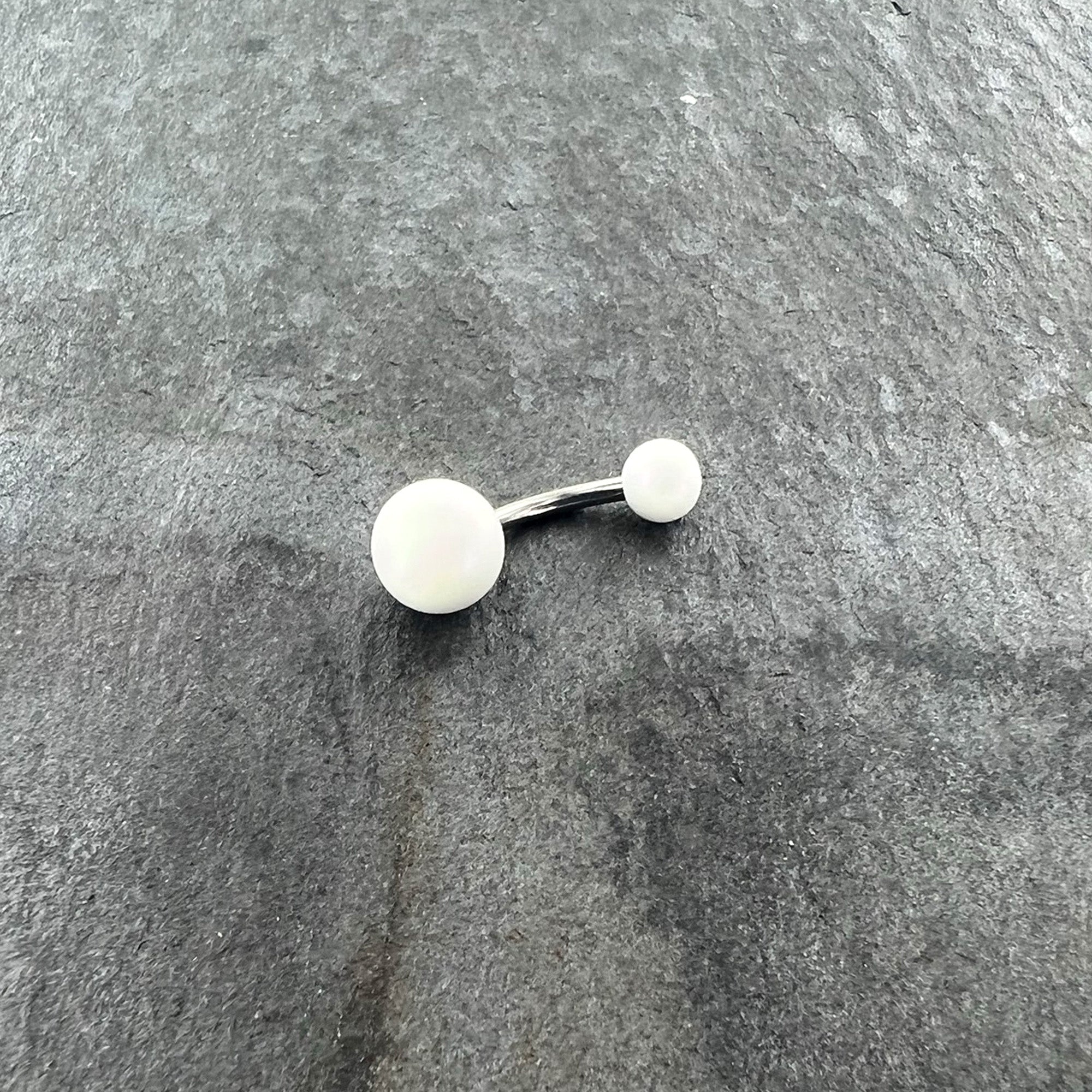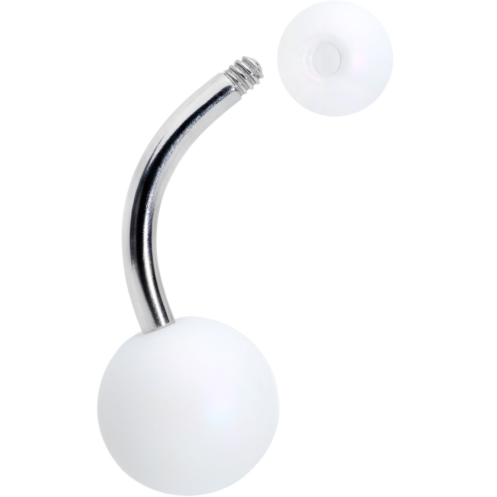 Don't let your look fall flat when you can go matte - like with this 14 gauge navel ring! It's made with a 10mm durable 316L surgical grade stainless steel curved barbell. It features a 5mm top ball end and an 8mm bottom ball end, which are made with white acrylic and feature a color-shift effect that can make them appear aurora as well. They're further embellished with a matte finish for a truly stylish look. You'll be mad about matte with this understated belly piercing jewelry!