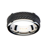 This men's ring is made with stainless steel inlaid with solid carbon graphite. This ring features a ridged leaf pattern design.