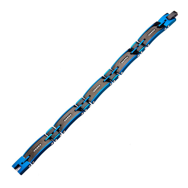 Mens Stainless Steel Solid Carbon Graphite and Blue IP with Clear CZ Gem Link Bracelet