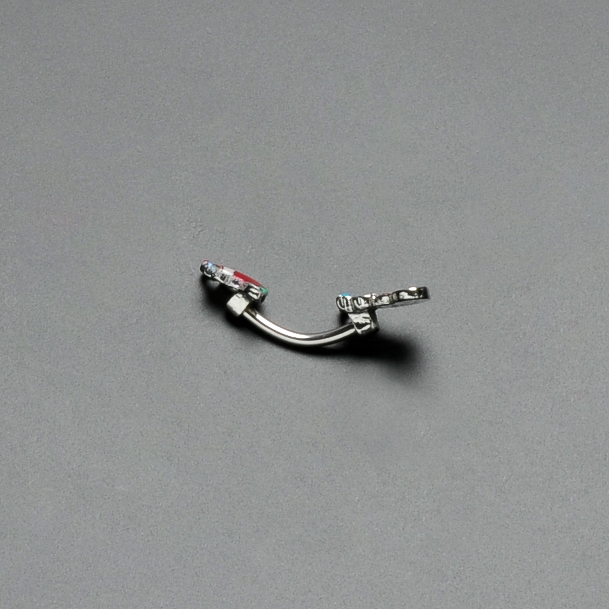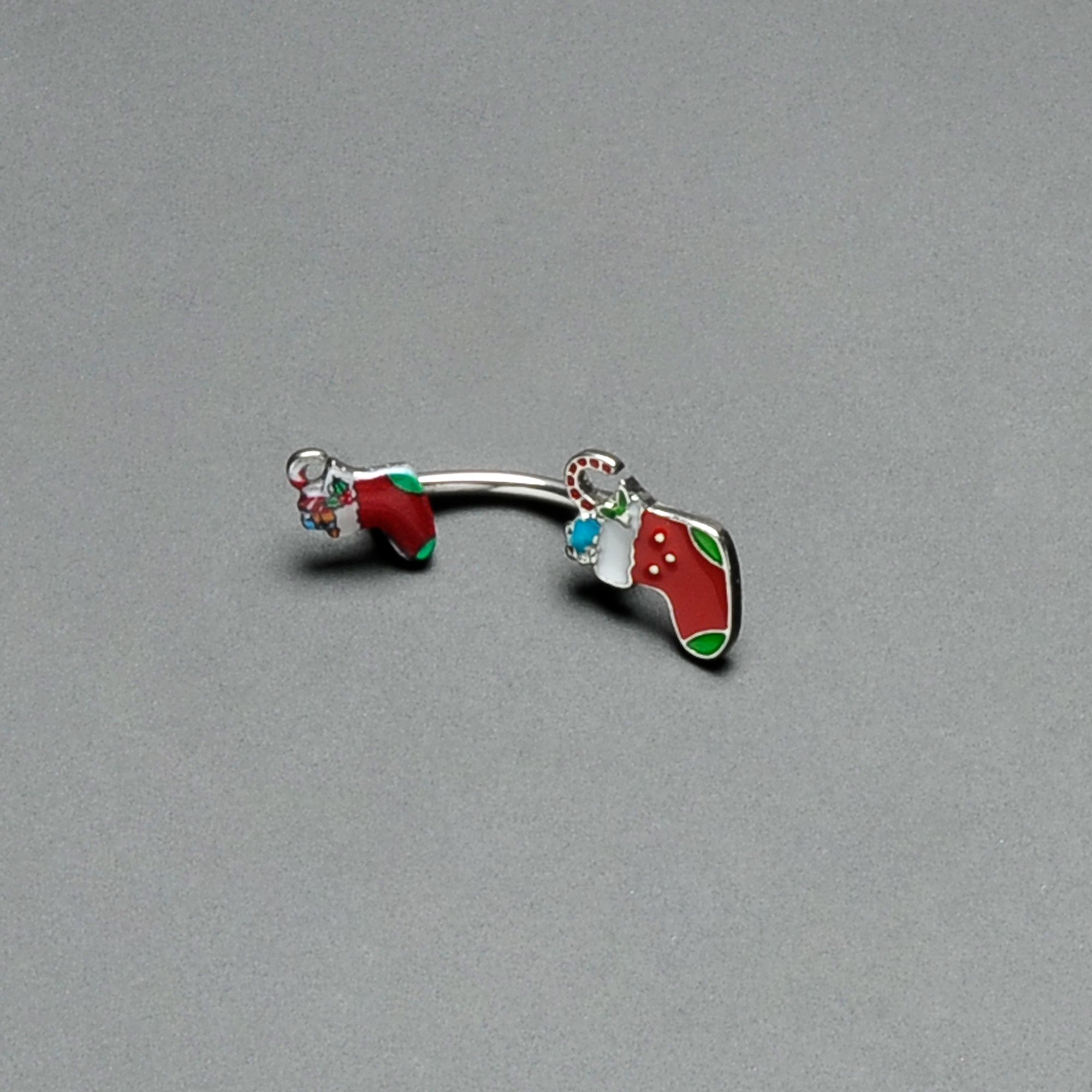 These stockings look as Merry as you'll be when you're rocking this 14 gauge navel ring! It's made with a 3/8" durable 316L surgical grade stainless steel curved barbell. The bottom end features a Christmas stocking charm, inlaid in red and green. The stocking features a candy cane and gift embellishments at the top and a tiny little face below the cuff. The top end features a matching stocking with simply styled detailing for a charmingly quirky appearance. These stockings are sure to make you smile back when you're rocking this festive, holiday belly piercing ring!
