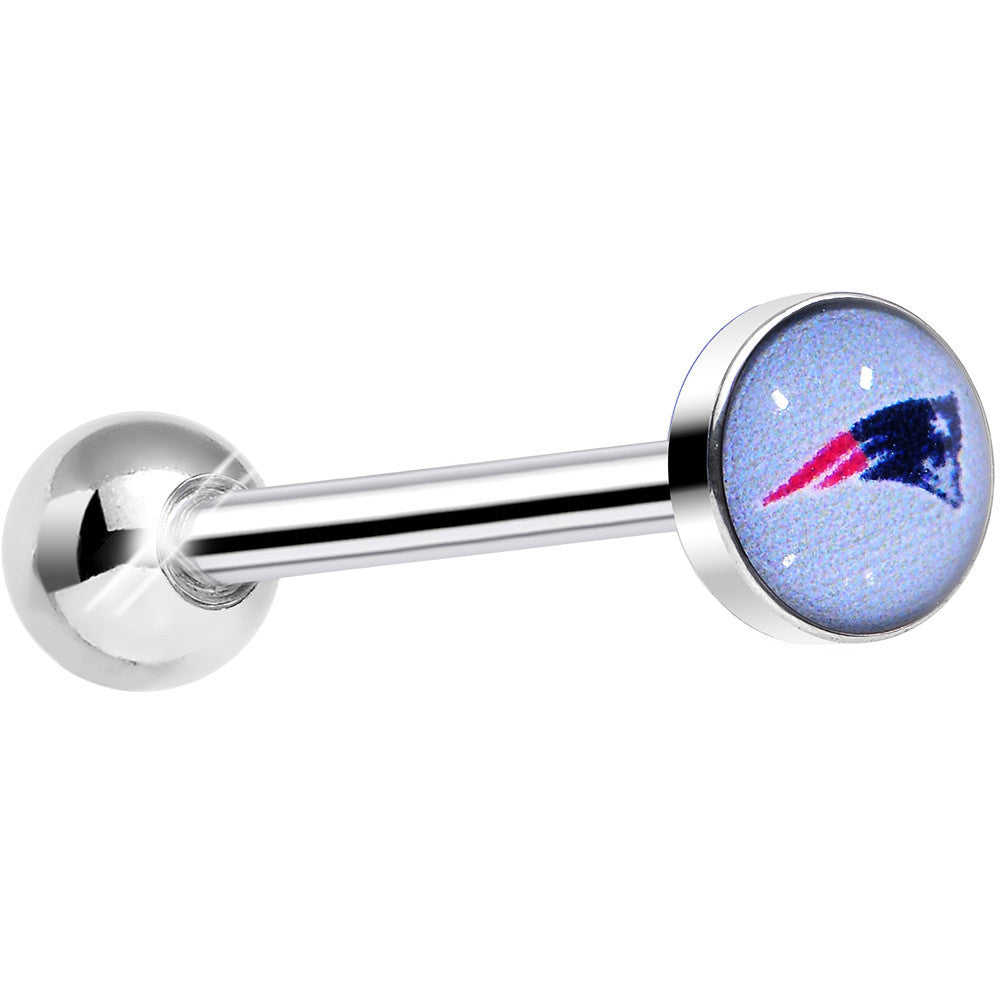 Show off team pride with an officially licensed NFL New England Patriots pierced tongue ring featuring the iconic red, white, and blue Patriots logo. 14 gauge, 16mm surgical stainless steel straight barbell works for multiple piercings. National Football League logo Body Jewelry./font>