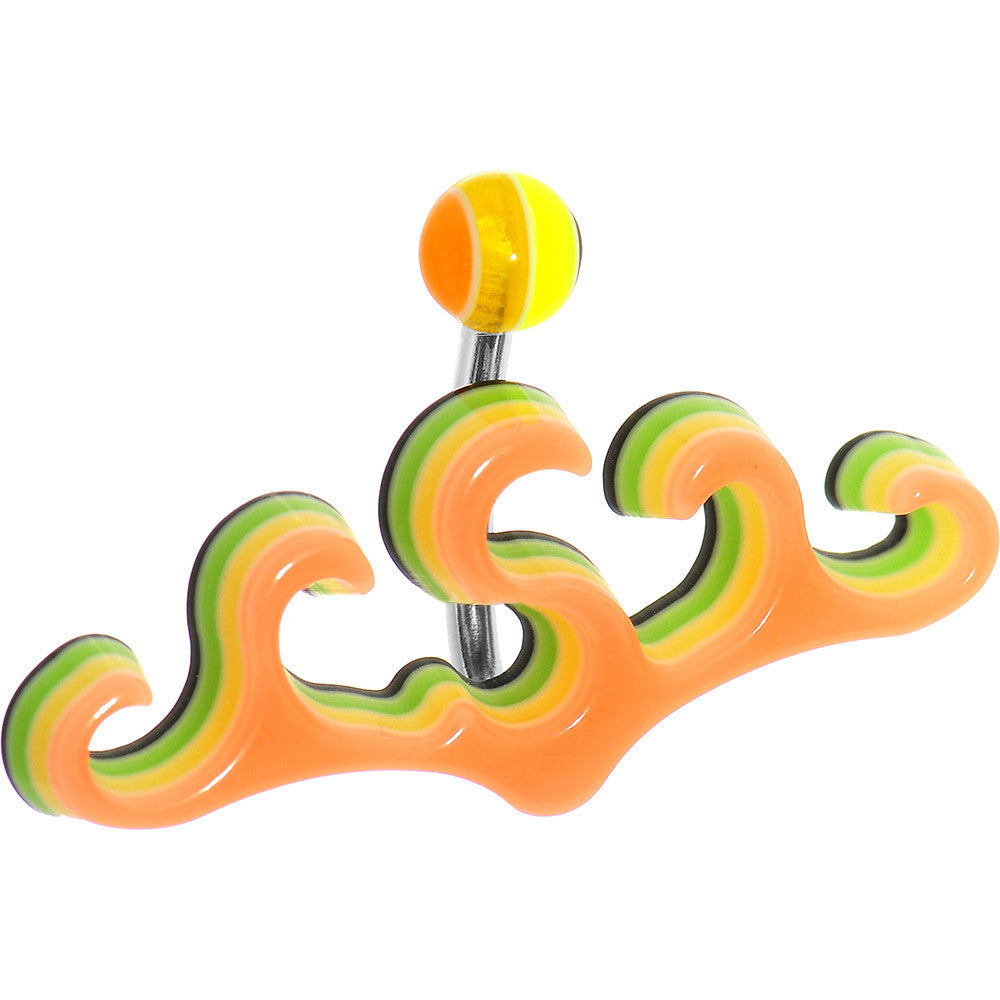 Hypoallergenic jewelry for sensitive skin.Get in style and add have fun with this colorful acrylic multi-layered belly button ring. Tribal-inspired navel ring features bright orange waves with different colors layered beneath and a multi-colored striped ball.