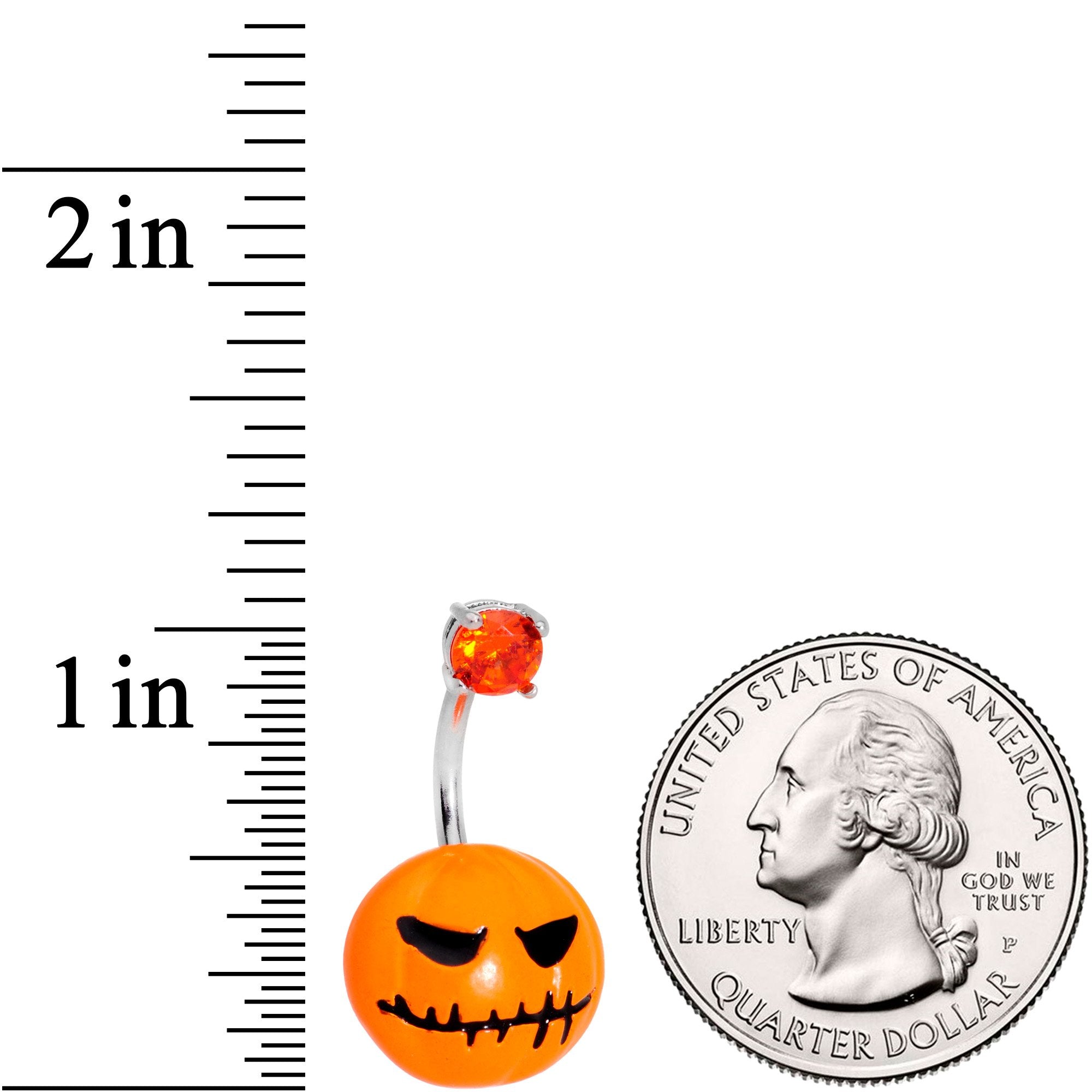 If you love all the creepiest parts of Halloween then you will love this 14 gauge belly button ring. Made with a 3/8" durable 316L surgical grade stainless steel curved barbell, this navel jewelry features an orange top gem as well as an orange jack o' lantern bottom charm.