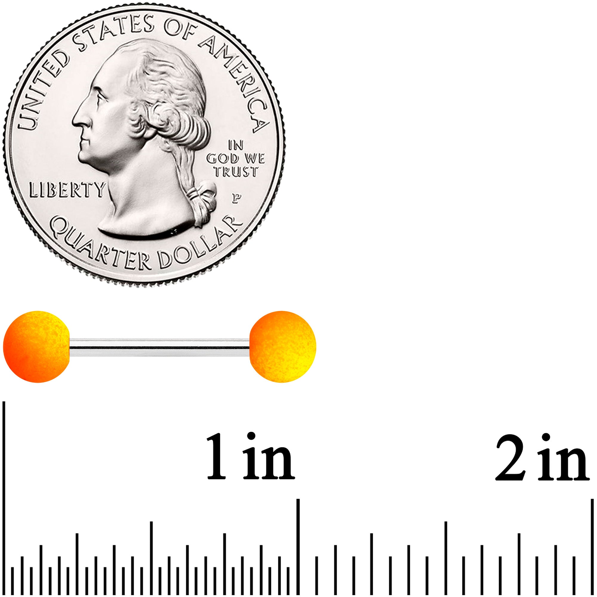 Some things need a softer touch....like this 14 gauge tongue ring! It's made with a 5/8" durable 316L surgical grade stainless steel straight barbell. It has 5mm ball ends that feature a finish that's slightly soft to the touch, a perfect contrast to the hot orange and bright yellow ombre colors! These bright, eye-catching colors are sure to stand out while their soft finish will ensure you will want to keep this tongue jewelry in your tongue piercing!