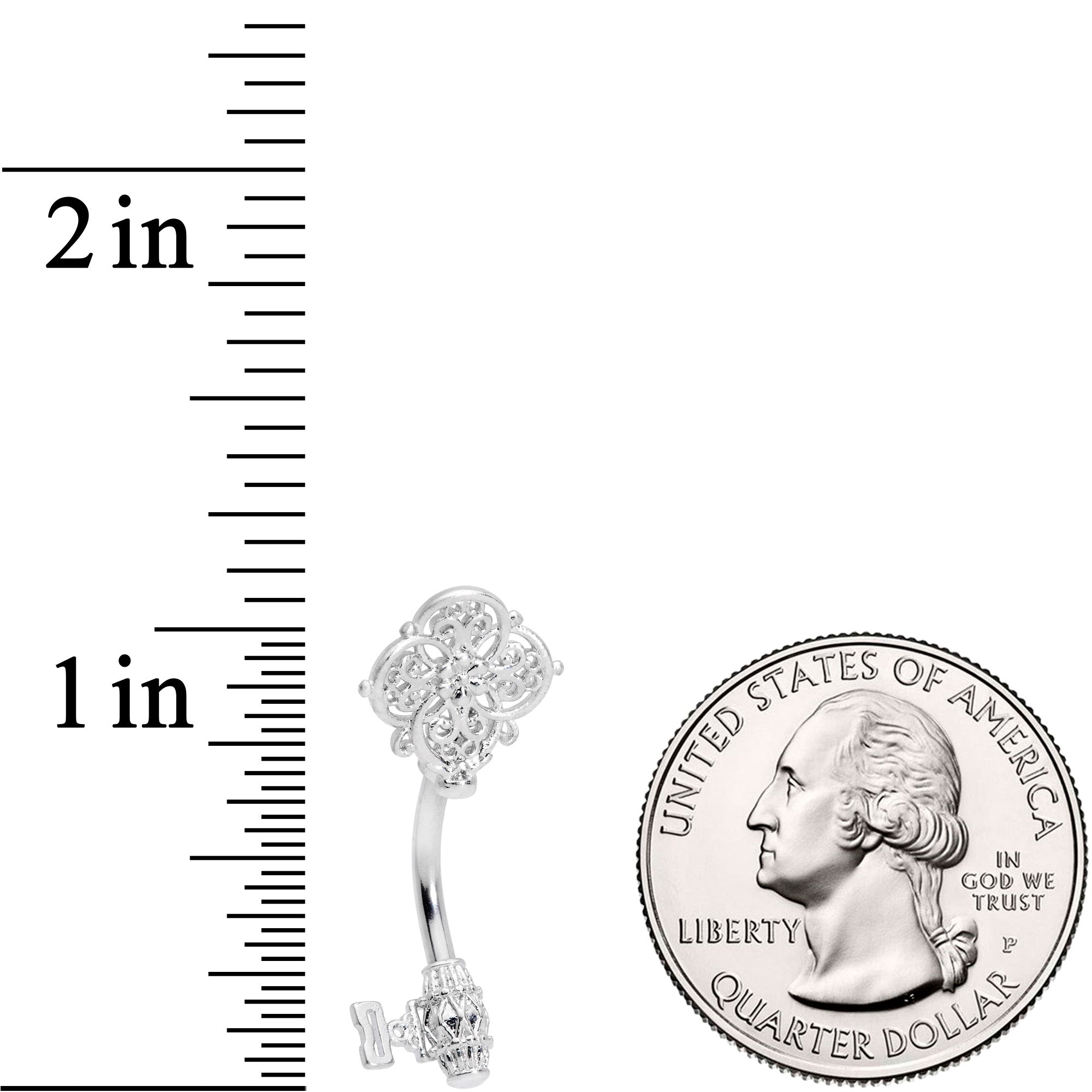 This 14 gauge navel ring has a delicate look that's so light and airy you won't be able to resist.....but don't be fooled! It's made with a 3/8" durable 316L surgical grade stainless steel curved barbell. The top charm is the key's bow with interlacing filigree swirls for a graceful appearance. The bottom end is the key's bit, with a simple barrel shape and openwork oblong embellishment. This belly button ring is sure to unlock the power of your piercing!