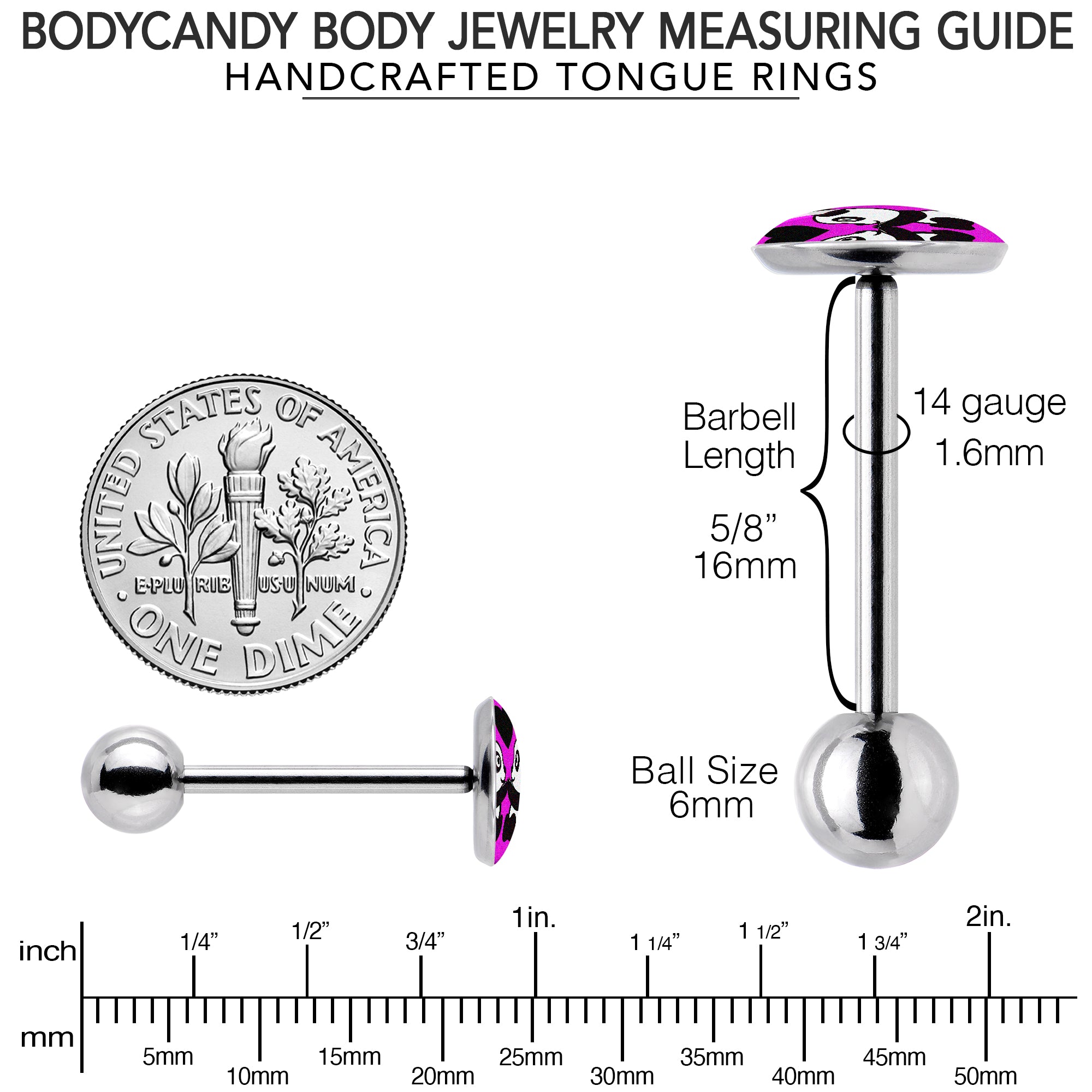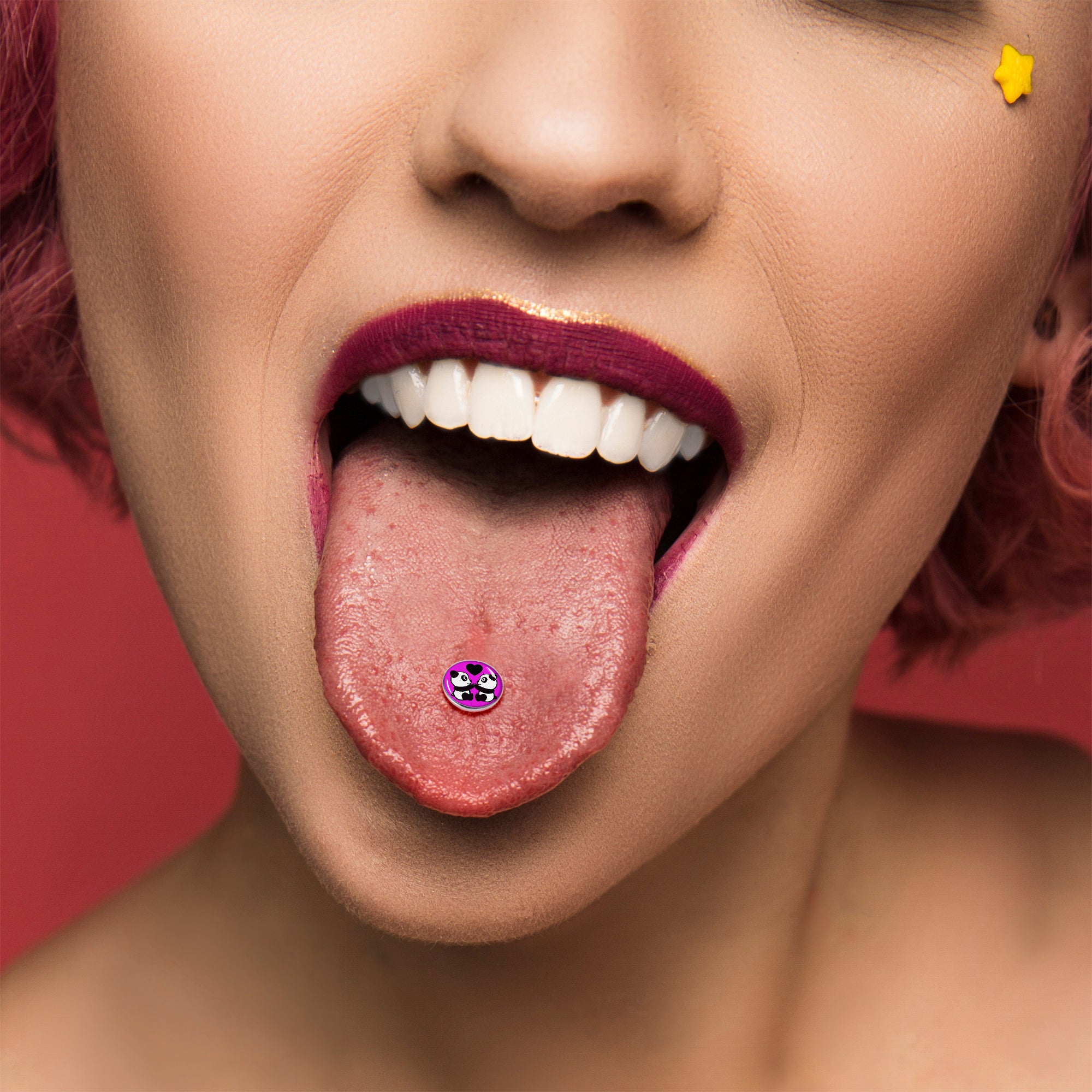 You will fall in love too with the happy panda bears on this 14 gauge tongue jewelry. It is made with a 5/8 inch 316L surgical grade stainless steel straight barbell with a 5mm bottom ball end. The top end features a purple disc charm. It features a pair of pandas, gazing lovingly at each other, with a heart above and between them. Love is for everyone when it comes to this pleasing panda tongue piercing ring.