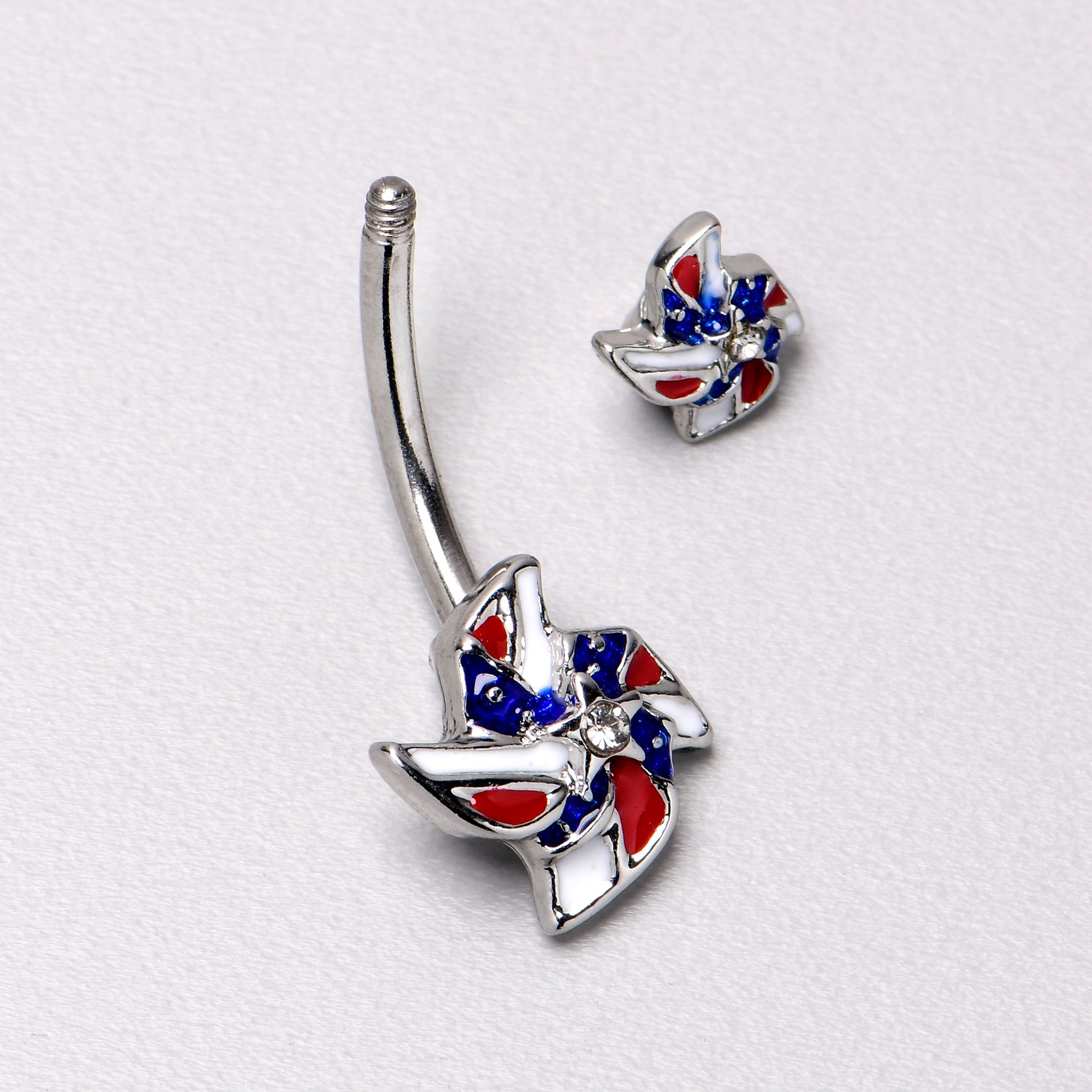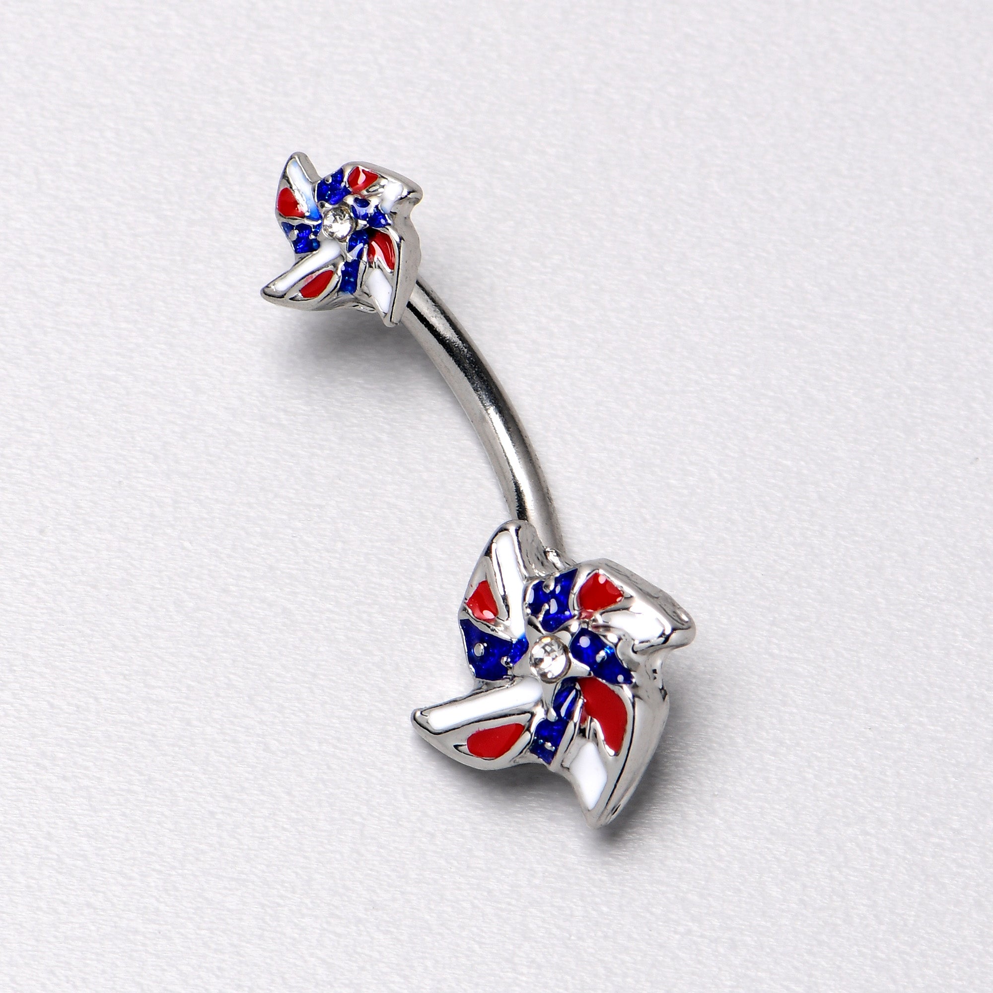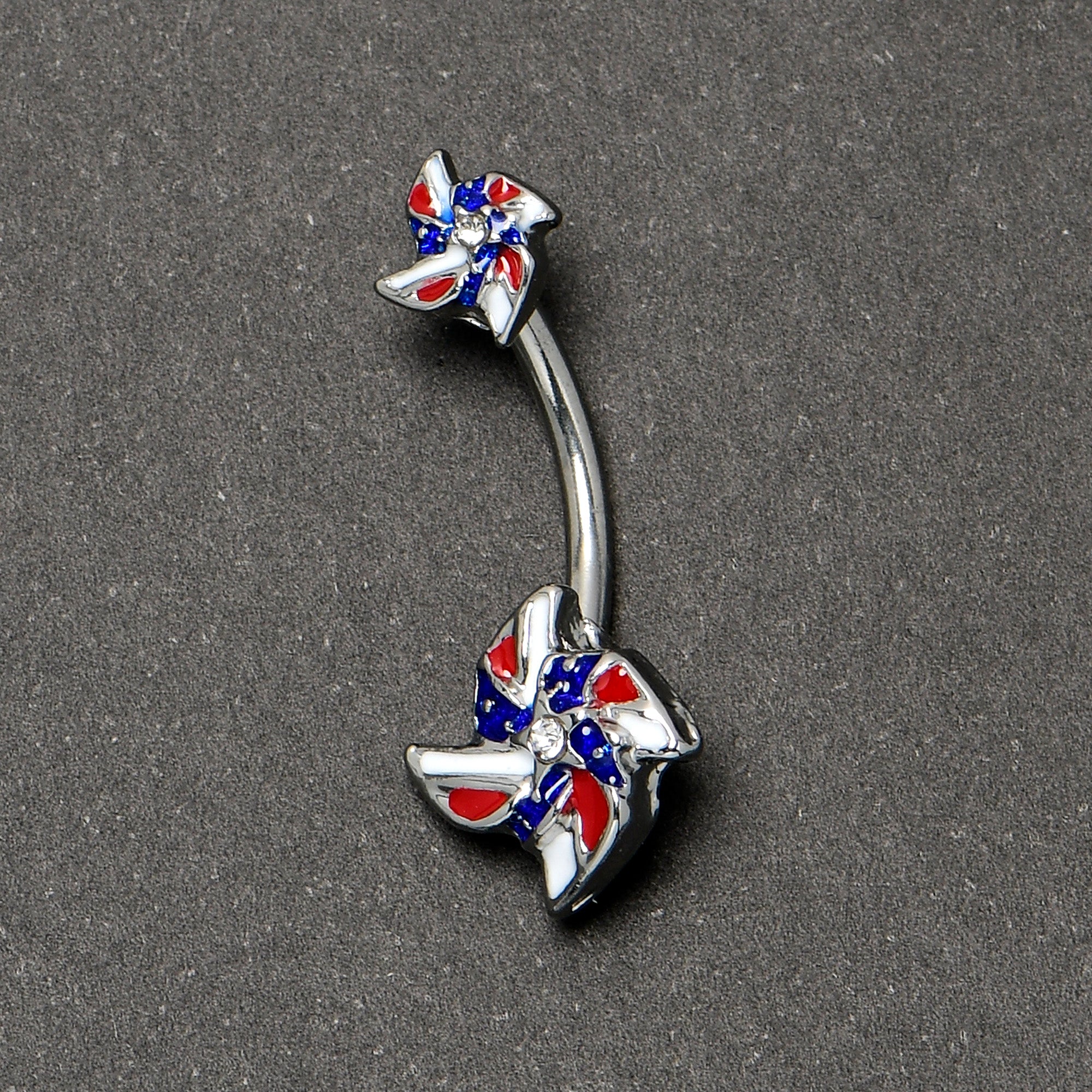Give a new patriotic look a whirl, like with this 14 gauge navel ring. It is made with a 3/8 inch 316L surgical grade stainless steel curved barbell. Each of the ends features a pinwheel charm, embellished in red, white, and blue inlay. This patriotic belly piercing jewelry will make your head spin!