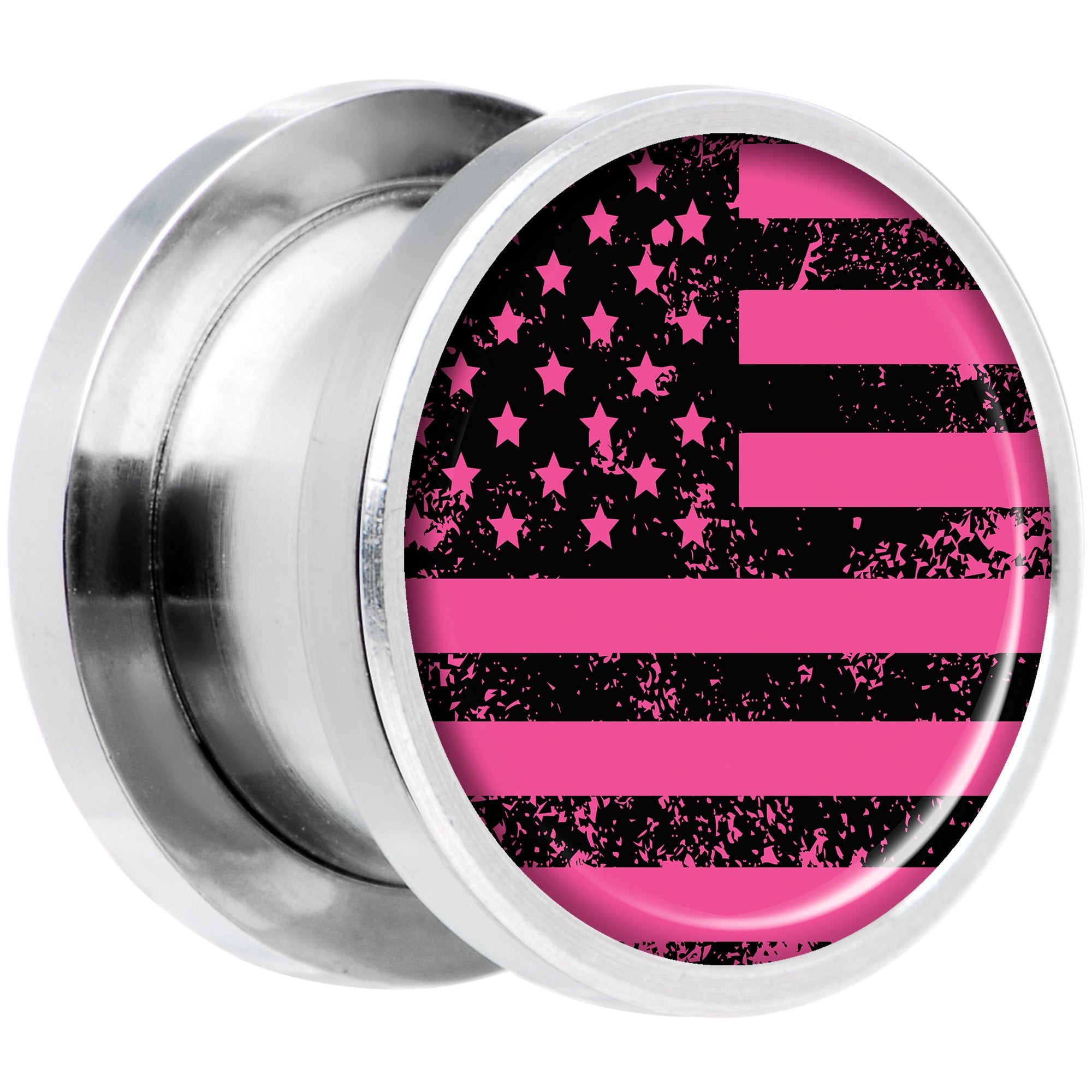 If you love the color pink and American flags then this pair of double flare plugs is right for you! Made with durable 316L surgical grade stainless steel, these 12mm ear gauges are made with a screw fit design for easier insertion and removal and are sold as a set of two for you.