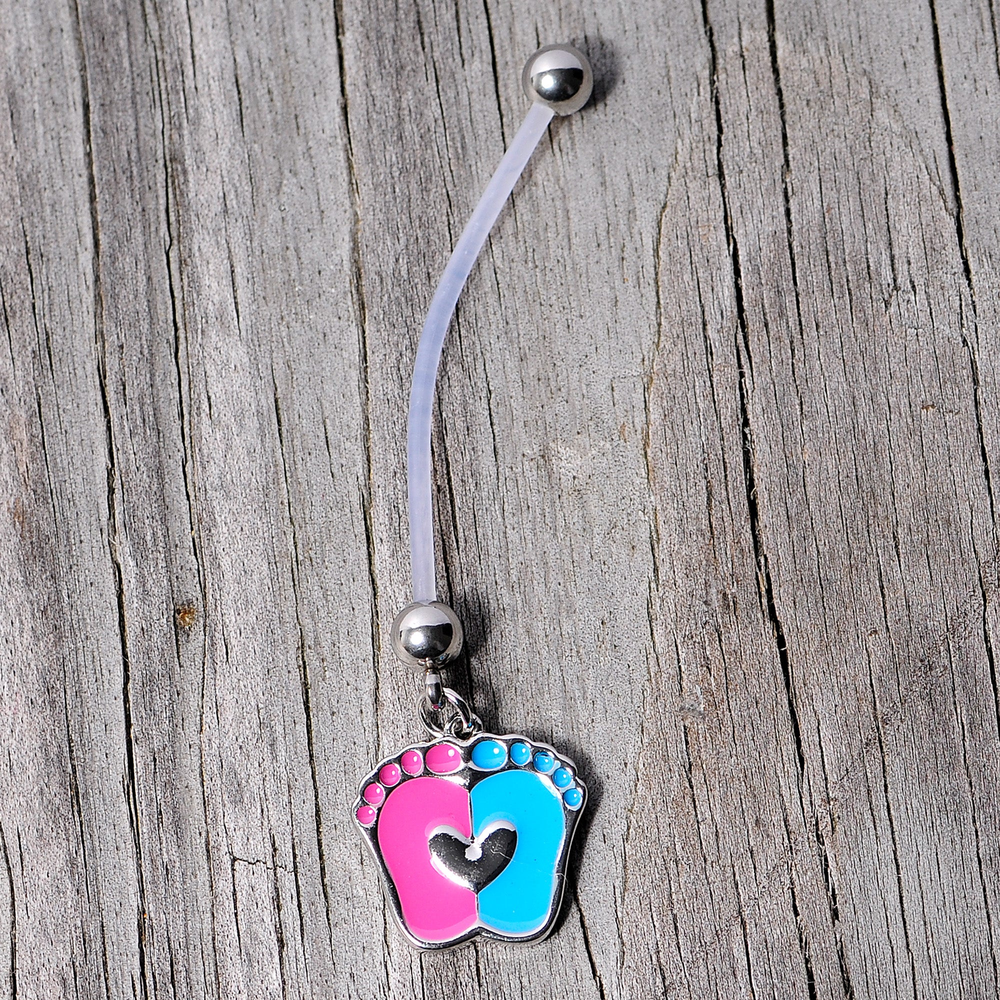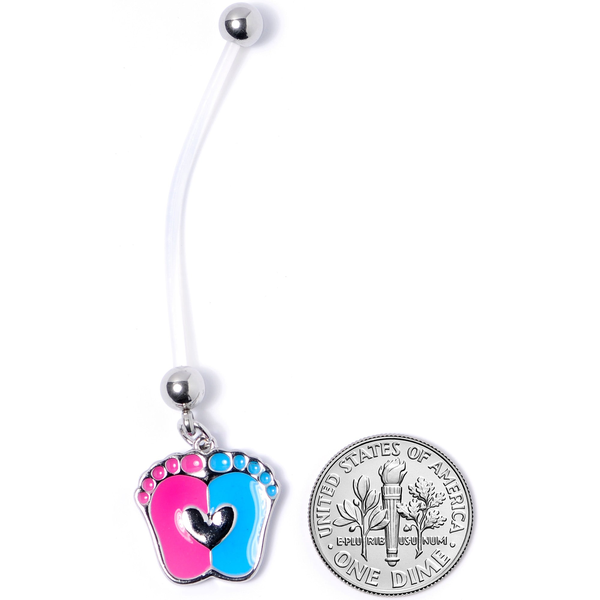 Whether it's a boy or a girl, you've got it covered with this 14 gauge pregnancy navel ring! It's made with a 2" clear Bioflex barbell with 5mm steel ball ends. Dangling from the bottom ball end is a pink and blue baby feet charm, with a heart-shaped embellishment on top of them. The flexible Bioflex barbell is self-threading and can be trimmed to a perfect fit. Simply cut where needed and reattach the ball end for a fit that's custom to your changing body. Let these little baby feet steal your heart - at least until the baby arrives!