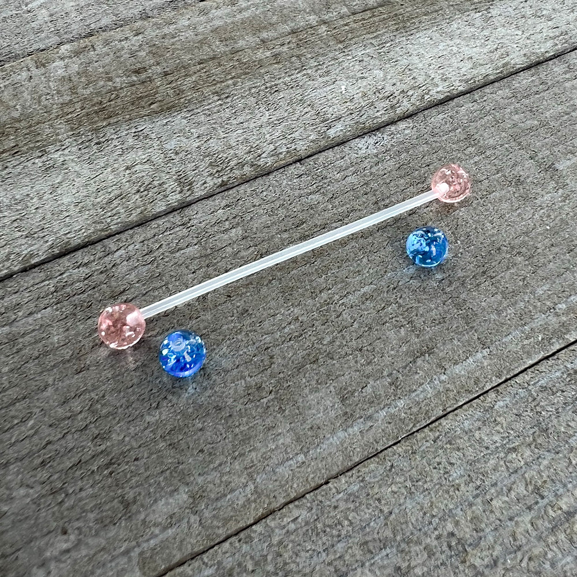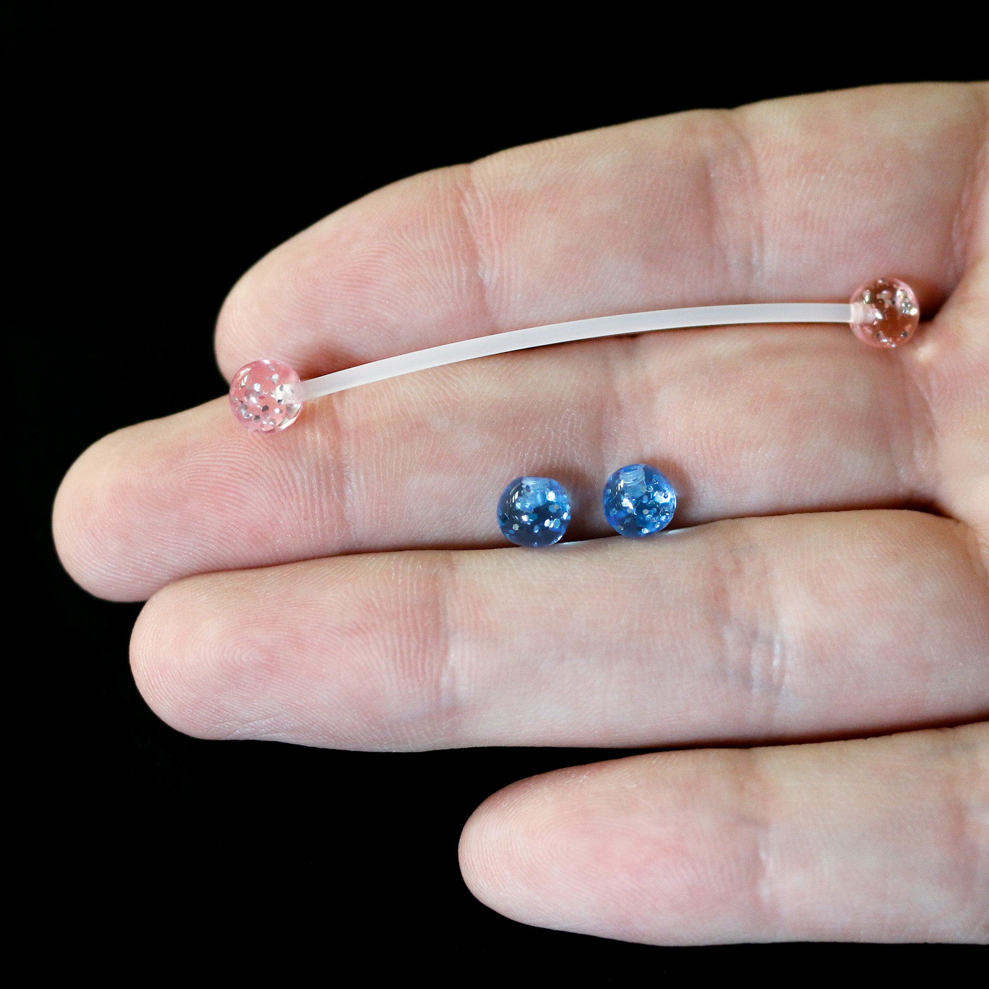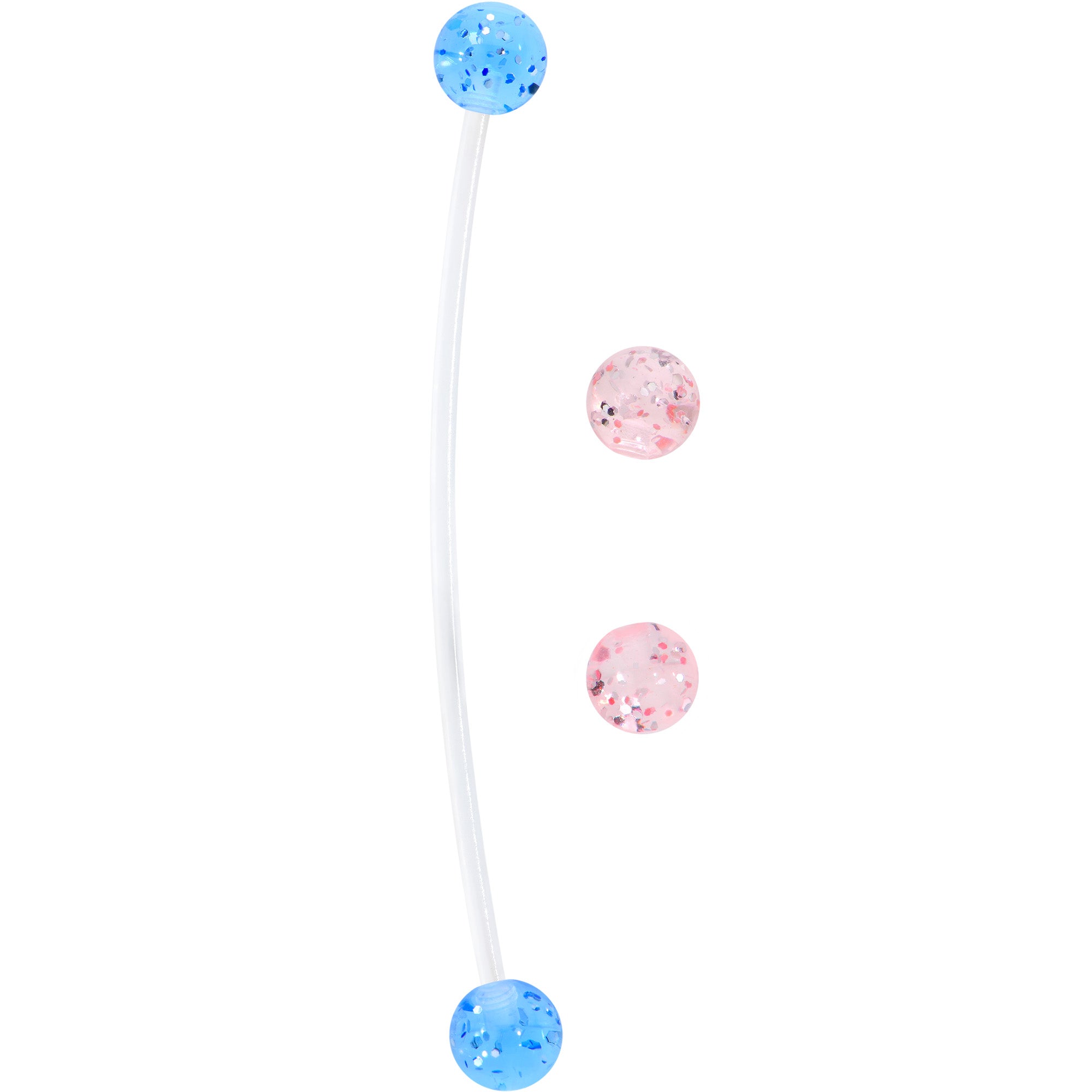 Add a touch of glam to your navel piercing with this 14 gauge pregnancy belly piercing jewelry! It's made with a 2" clear, flexible Bioplast straight barbell with 6mm ball ends. You get one set of clear pink ball ends and one set of blue clear ball ends and both sets feature glitter inside. The flexible Bioflex barbell is self-threading and can be trimmed to a perfect fit. Simply cut where needed and reattach the ball end for a fit that's custom to your changing body. Add some glitter and glamour to your look with this pregnancy navel piercing jewelry.