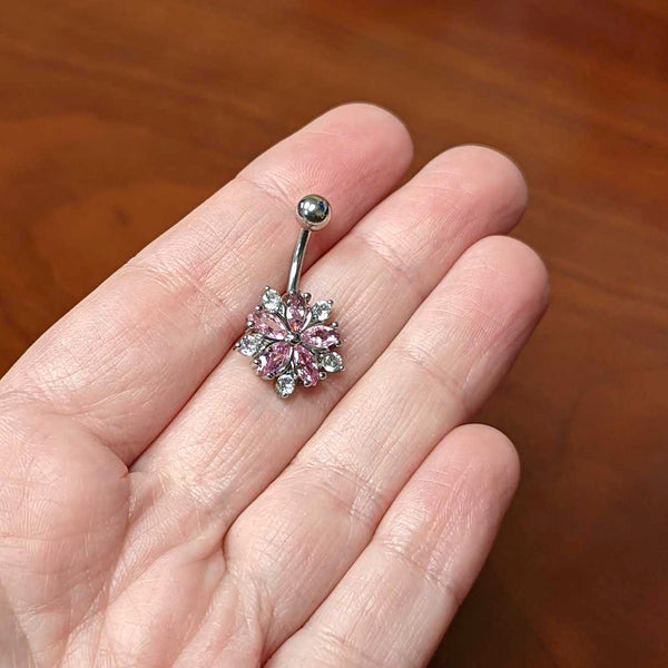 Your belly piercing will be bursting with style when you're rocking this 14 gauge navel ring! It's made with a 3/8" durable 316L surgical grade stainless steel curved barbell with a 5mm top ball end. The bottom end features a floral charm, composed of a pink cubic zirconia gem flower. The large petals are in full bloom and the flower is further embellished with smaller, clear cubic zirconia gems along the edge. Burst into style with this fabulous, flower navel piercing ring!