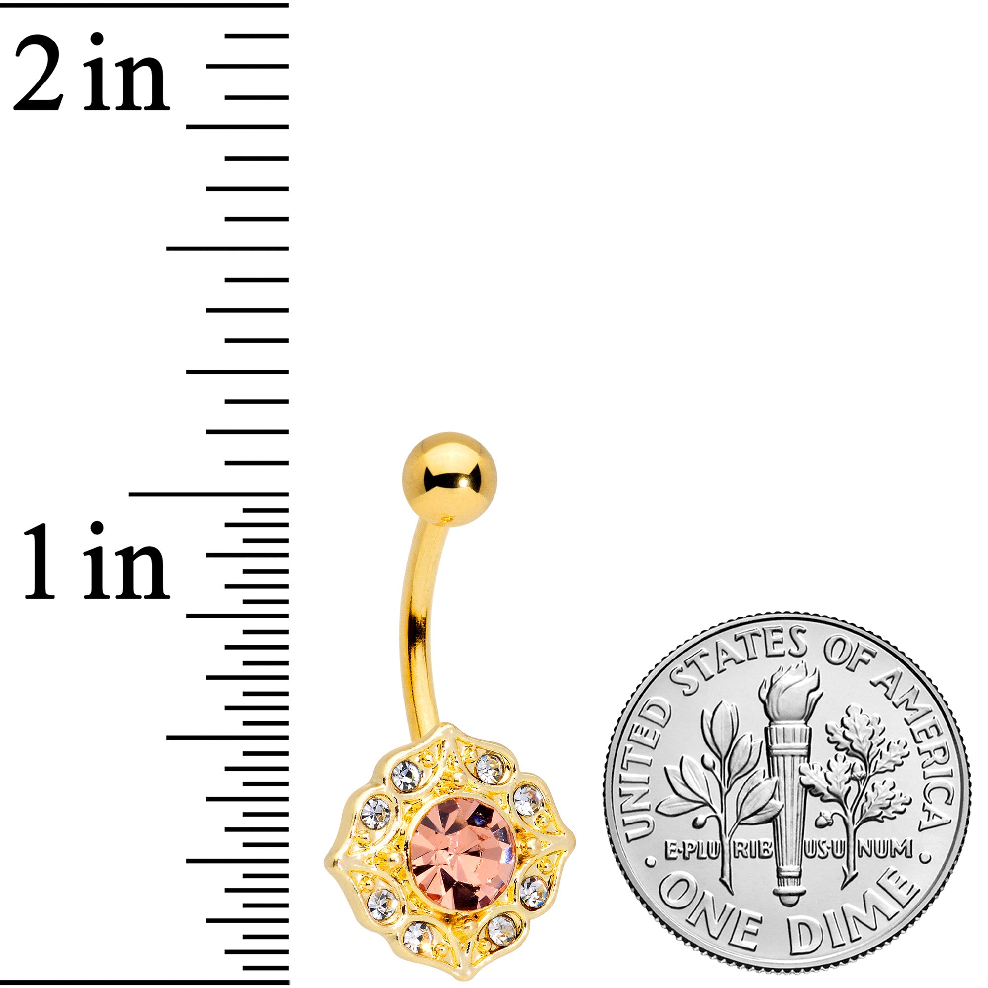This 14 gauge bottom mount navel ring absolutely screams with antique style with a totally modern flair! It's made with a 7/16" gold tone anodized over 316L surgical grade stainless steel curved barbell with a 5mm top ball end. The bottom end features a ring of clear gems. Set in the center of the ring is a large pink gem, faceted to catch the light as well as every eye around! The old-fashioned flair combined with updated style will have you loving this beautiful baroque belly button ring!