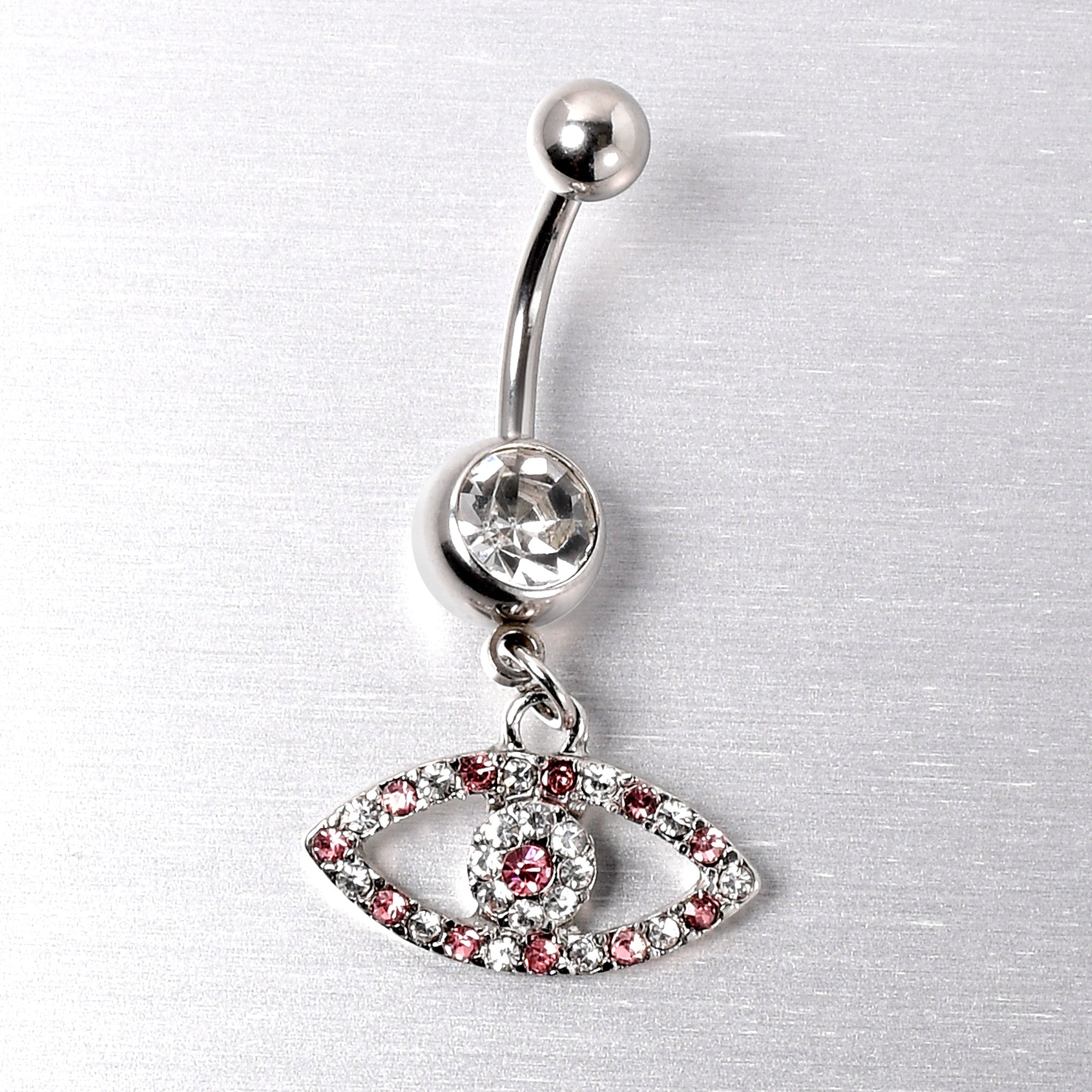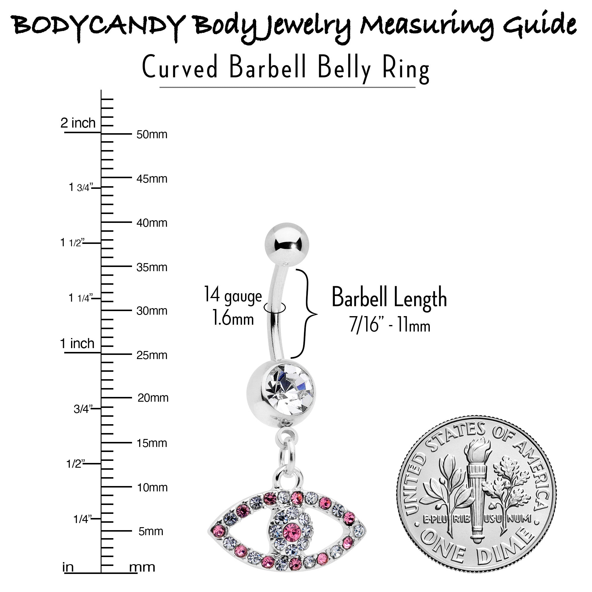 Keep your eyes open and you will spot amazing things - like this 14 gauge navel ring. It is made with a 3/8 inch durable 316L surgical grade stainless steel curved barbell with a 5mm top ball end. The bottom ball end is 8mm and set with a clear gem.Dangling beneath is an eye charm, with the rim paved in pink and clear gems. The center of the eye features more clear and pink gems for a cohesive look. You will have all eyes on you with this eye-opening belly piercing ring.