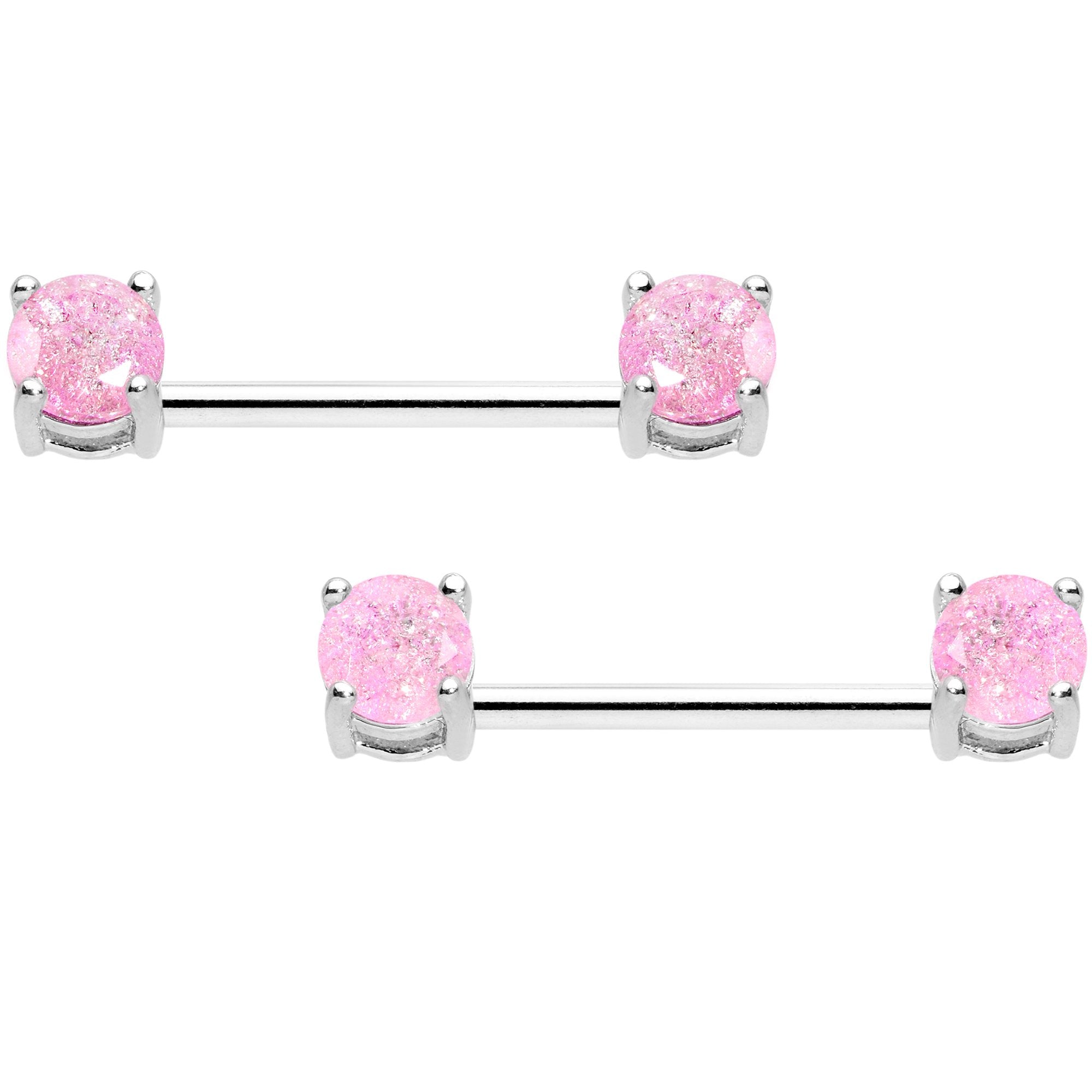 This fun set of nipple BCR captive rings and straight barbell nipple rings gives you a lot of options. Wear the matching set of captive rings, the matching set of barbells, or mix them up! The 14 gauge captive nipple rings are 1/2" in length, feature pink cubic zirconia front facing gems, and are made with durable 316L surgical grade stainless steel. The 9/16" straight barbells are also 14 gauge, feature pink cubic zircnoia gems, and are made with durable 316L surgical grade stainless steel. Sold as a set of four!