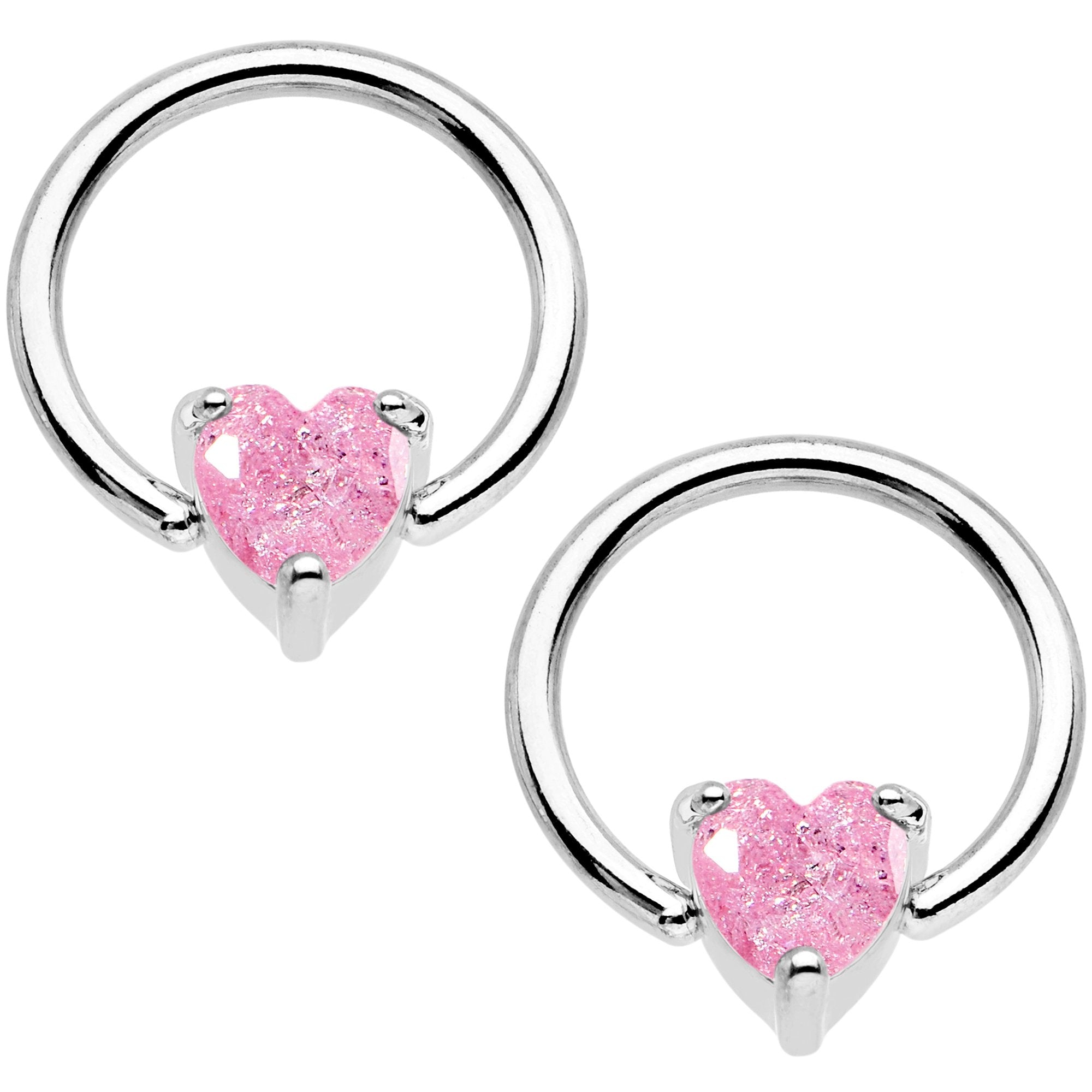 14G Pink CZ Gem Heart Captive Ring Barbell Nipple Ring Set