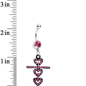 Build a snowman of love with the help of this dangle navel ring featuring a 316L surgical grade stainless steel curved barbell that measures 7/16" (11mm) in length. The barbell body jewelry includes an 8mm bottom ball end that contains a single pink accent. This belly ring has a dangling design of three (3) consecutive hollow black hearts with a pair of arms bisecting the "head" and the "torso" of this romantic snowman figure. This snowman has just as much style as you will have wearing this navel jewelry with its tiny pink accents all along the outline.