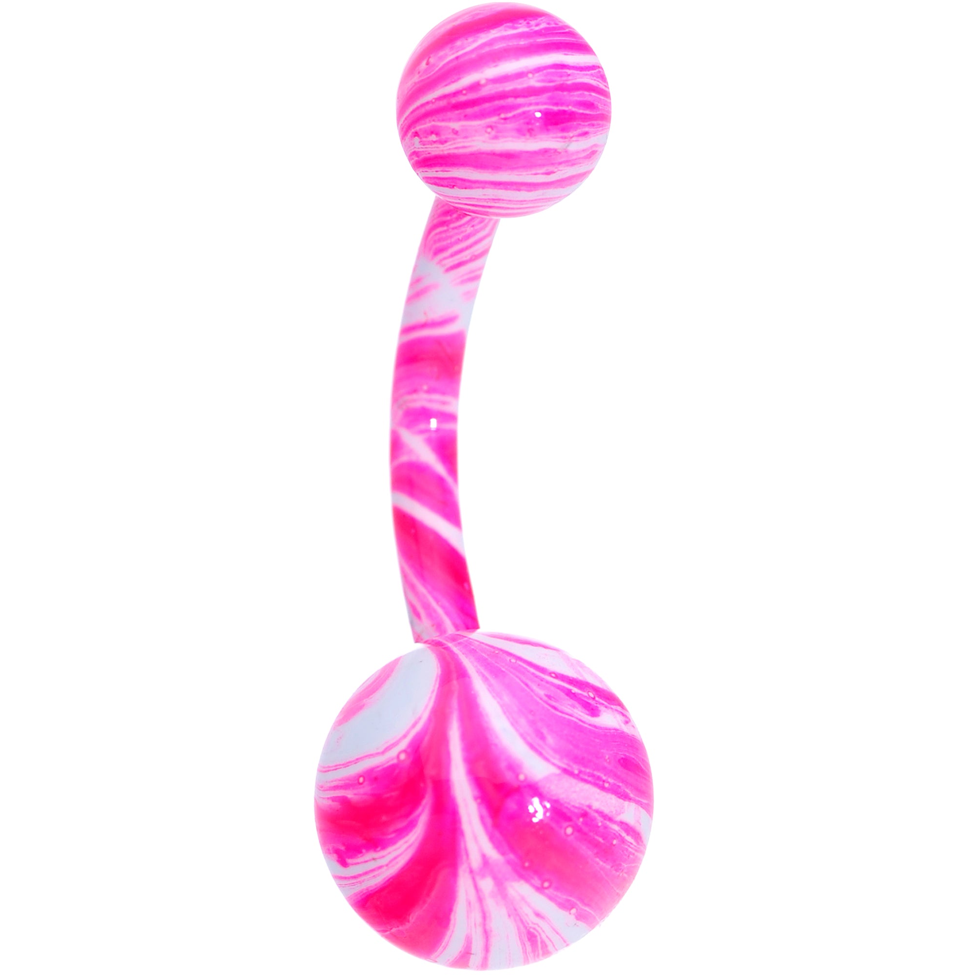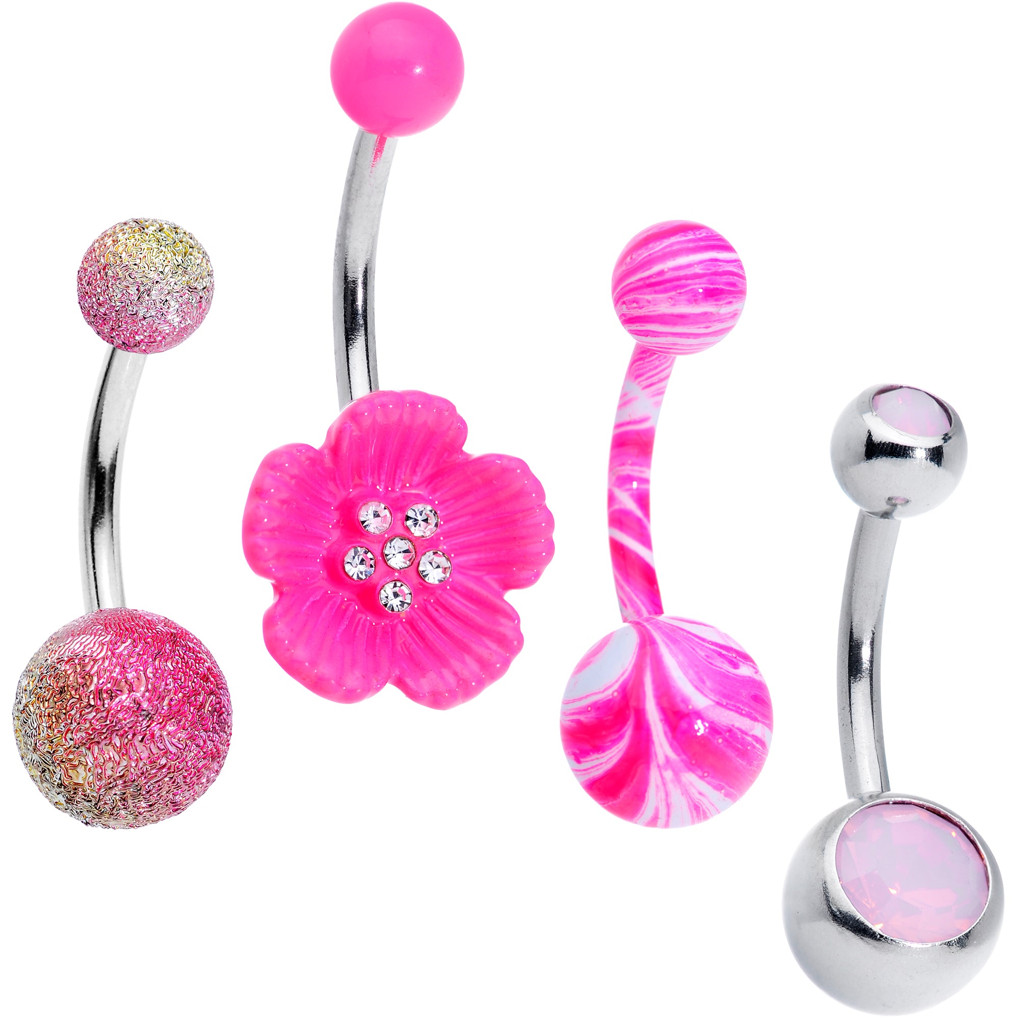 This set of 14 gauge navel rings will have your belly piercing in the pink! Three are made with 3/8" durable 316L surgical grade stainless steel curved barbells. One has a 5mm top ball end and an 8mm bottom ball end, both of which are set with pink faux opals. The second one features a 5mm top ball end and 8mm bottom ball end, both with a pink sandblasted finish. The third features a 5mm pink top ball end and a flower charm at the bottom. The flower is set at the center with clear gems for some added style. The fourth is made with a 3/8" pink and white plated over 316L surgical grade stainless steel curved barbell. It has a marbled effect that's eye-catching and stylish. If you're passionate about pink, this set of belly jewelry has your every need covered! Sold as a set of four.