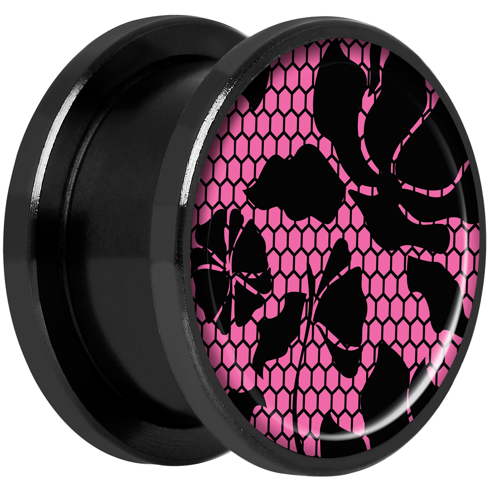 Pink Floral Lace Black Anodized Screw Fit Plug Set 5/8