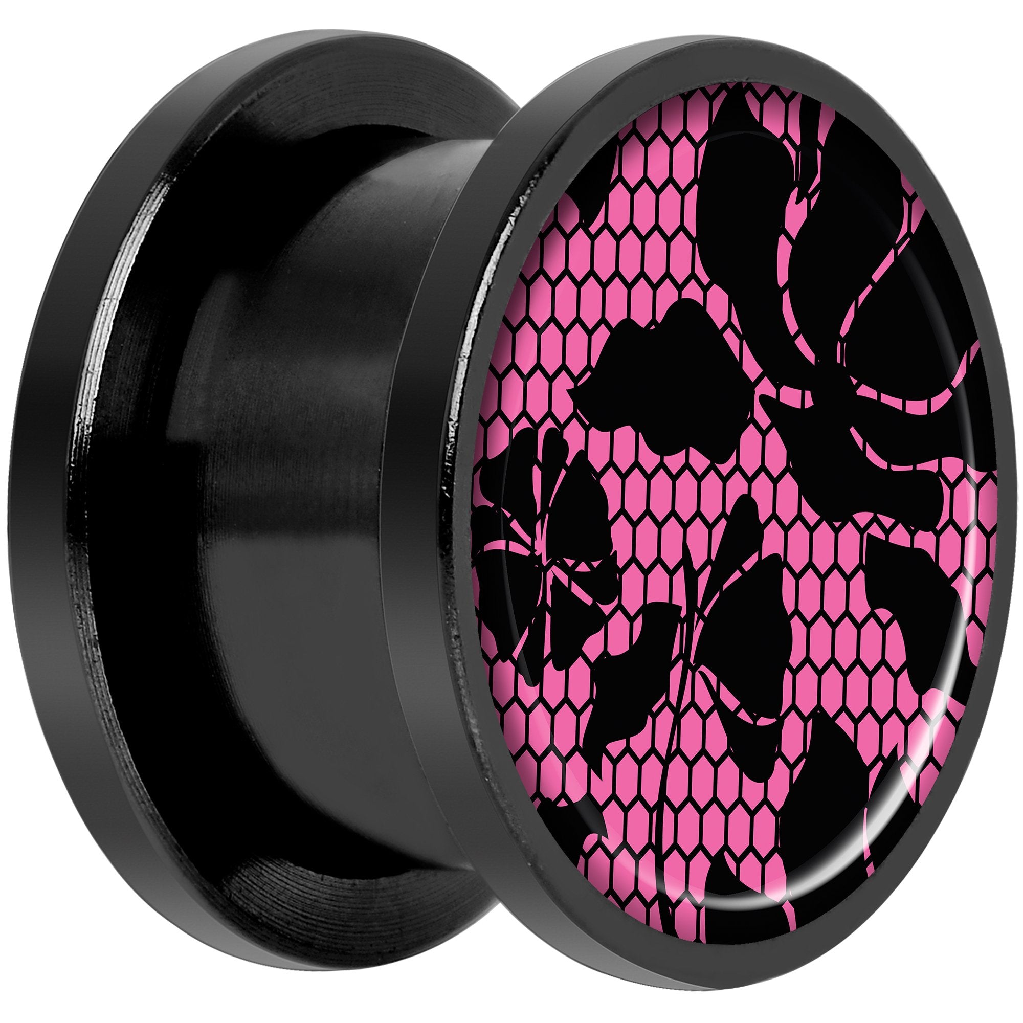 Pink Floral Lace Black Anodized Screw Fit Plug Set 9/16"