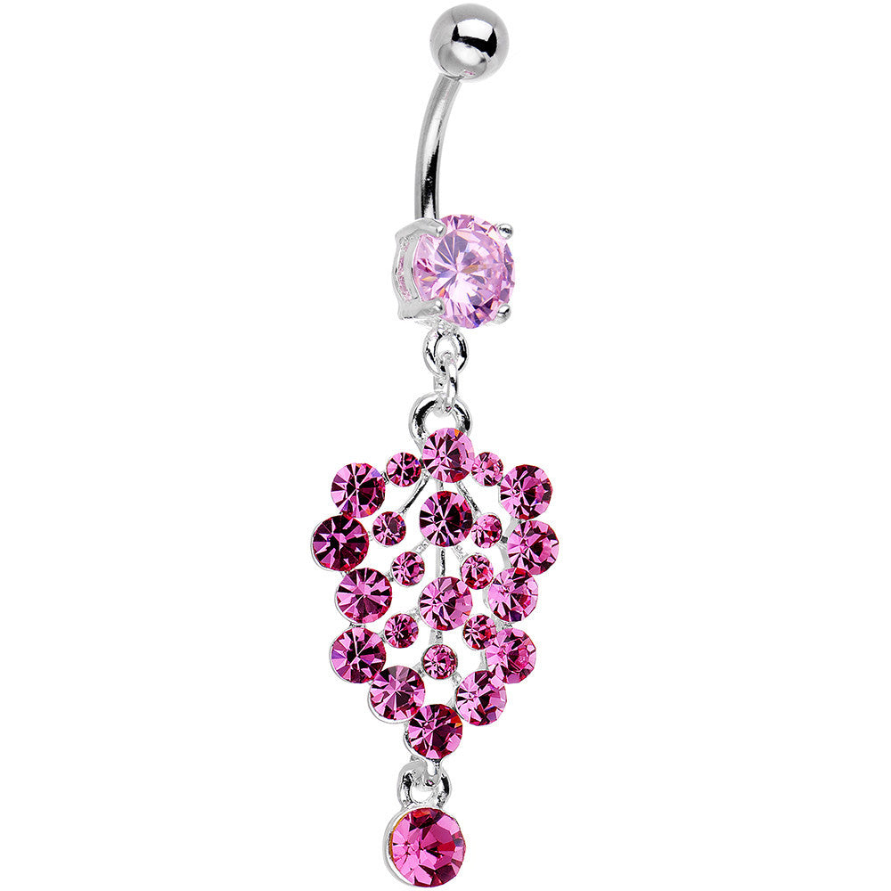 Let the colors you adorn yourself with speak volumes about you when you wear this stunning 14 gauge navel piercing. Made with a durable 7/16" surgical grade stainless steel curved barbell, this belly button ring features a pink bottom gem as well as a lush chandelier dangle charm set with a series of darker pink gems that seem to cascade down to a single pink gem drop dangle. Whether you are seeking a pretty pink look or soft, delicate style this navel jewelry might just be for you.