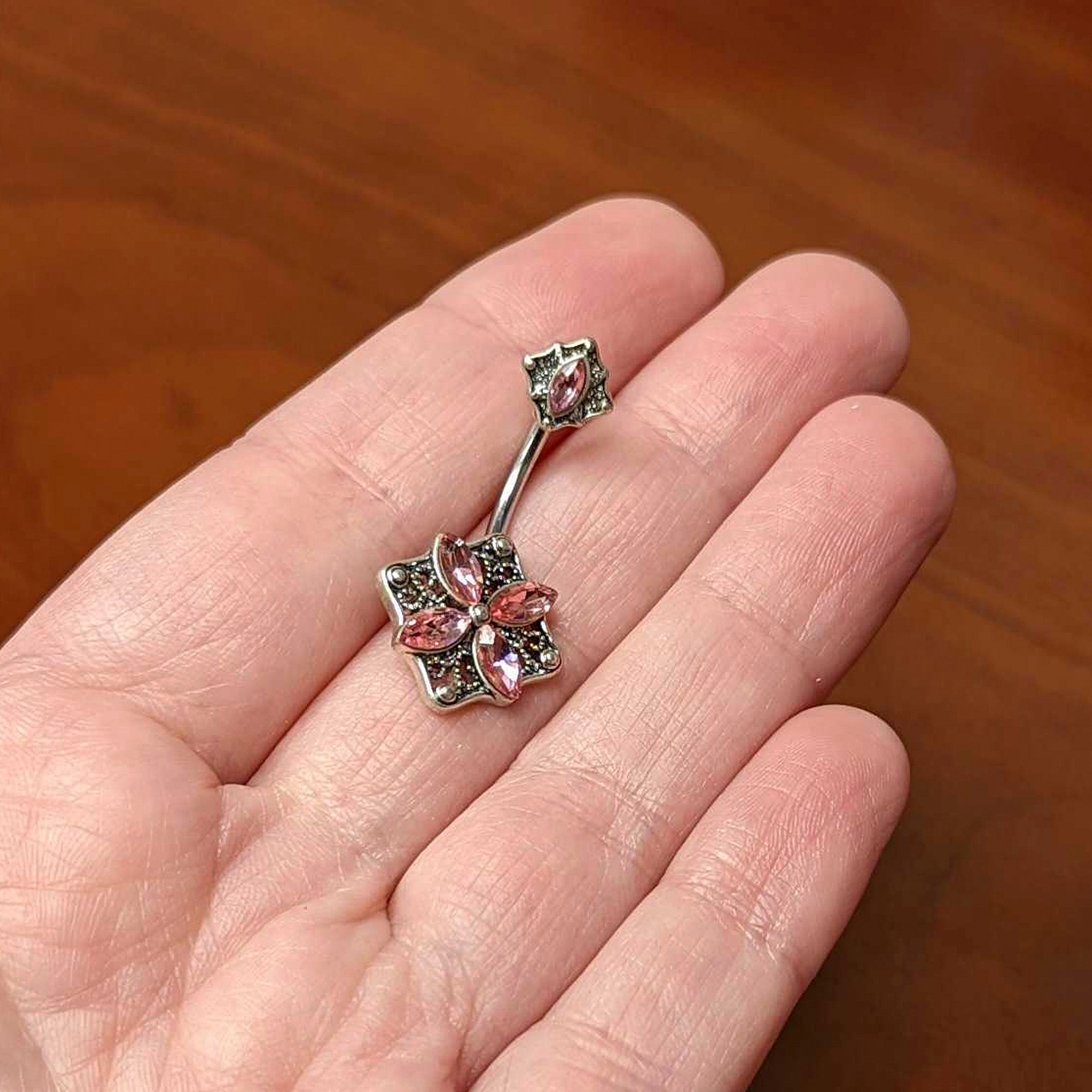 Get ready to blossom when you rock the rhombus on this 14 gauge navel ring! It's made with a 3/8" durable 316L surgical grade stainless steel curved barbell. The top end features a rhombus charm with textured embellishment. It is further embellished with a pink gem oval set into the rhombus.The bottom end features a matching rhombus charm with textured embellishment and is further embellished with a pink gem flower set into the rhombus. Your belly piercing will bloom in elegant fashion with this regal rhombus navel piercing ring!