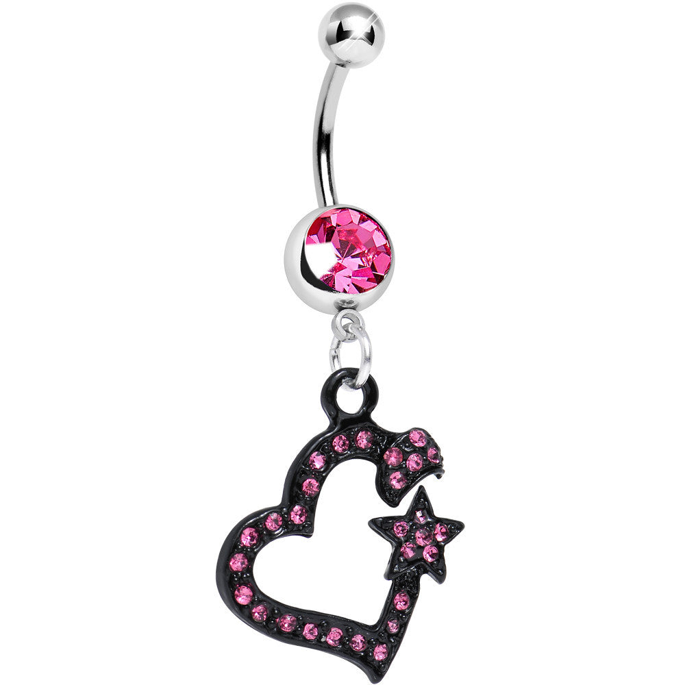 Fall in love with heavenly bodies when you wear this adorable dangling navel ring. Dazzling miniature pink gems accent this dark hollow heart that is accented with a joined star and moon. Curved barbell design provides plenty of comfort and easy wearing.