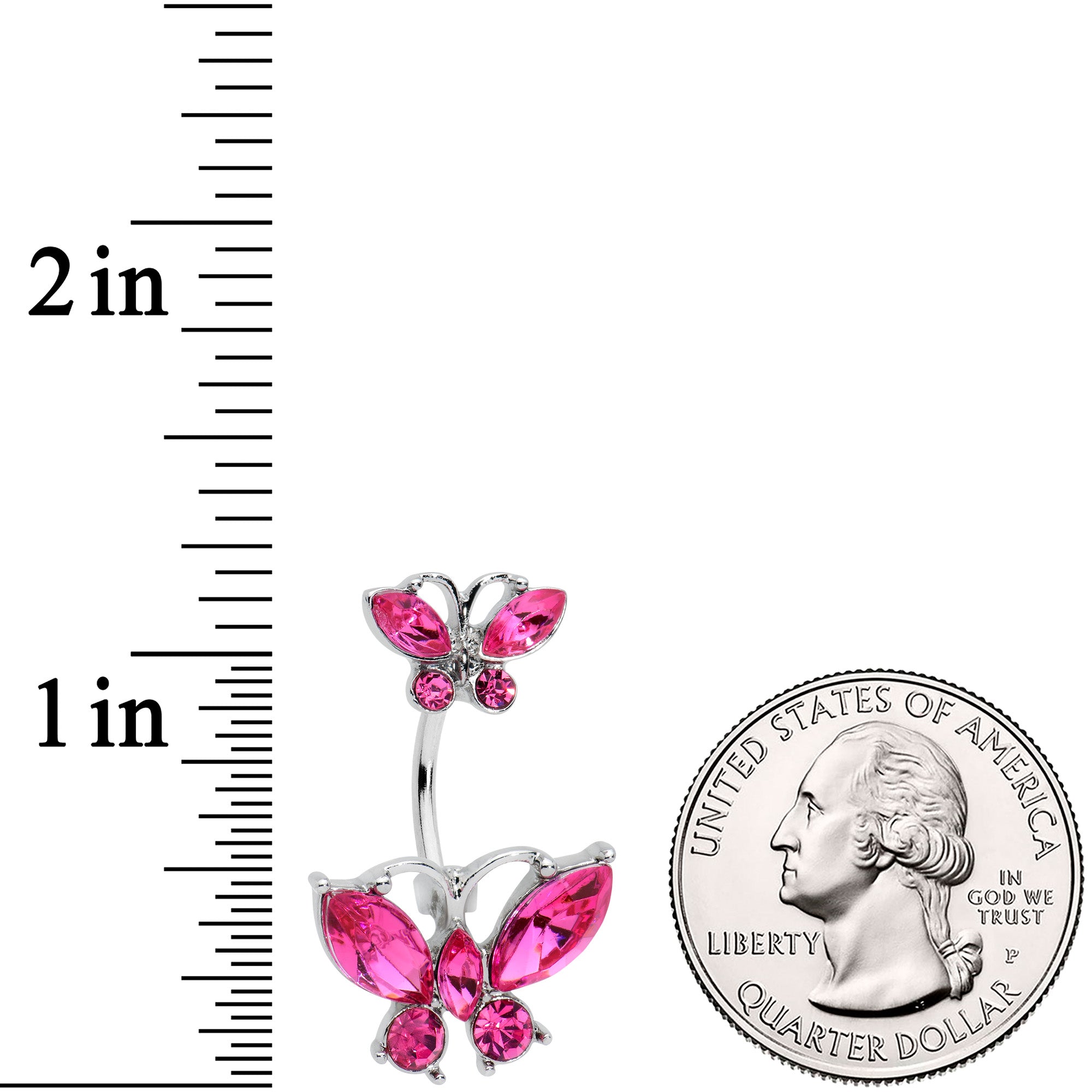 Double your style with this 14 gauge navel ring! It's made with a 3/8" durable 316L surgical grade stainless steel curved barbell. The top end features a butterfly charm, entirely composed of pink gems. It's further embellished with tiny antennae for a touch of realism. The bottom end features a matching butterfly, further embellished with a pink gem body. Get twice the style with this marvelous, matching butterfly belly button jewelry!