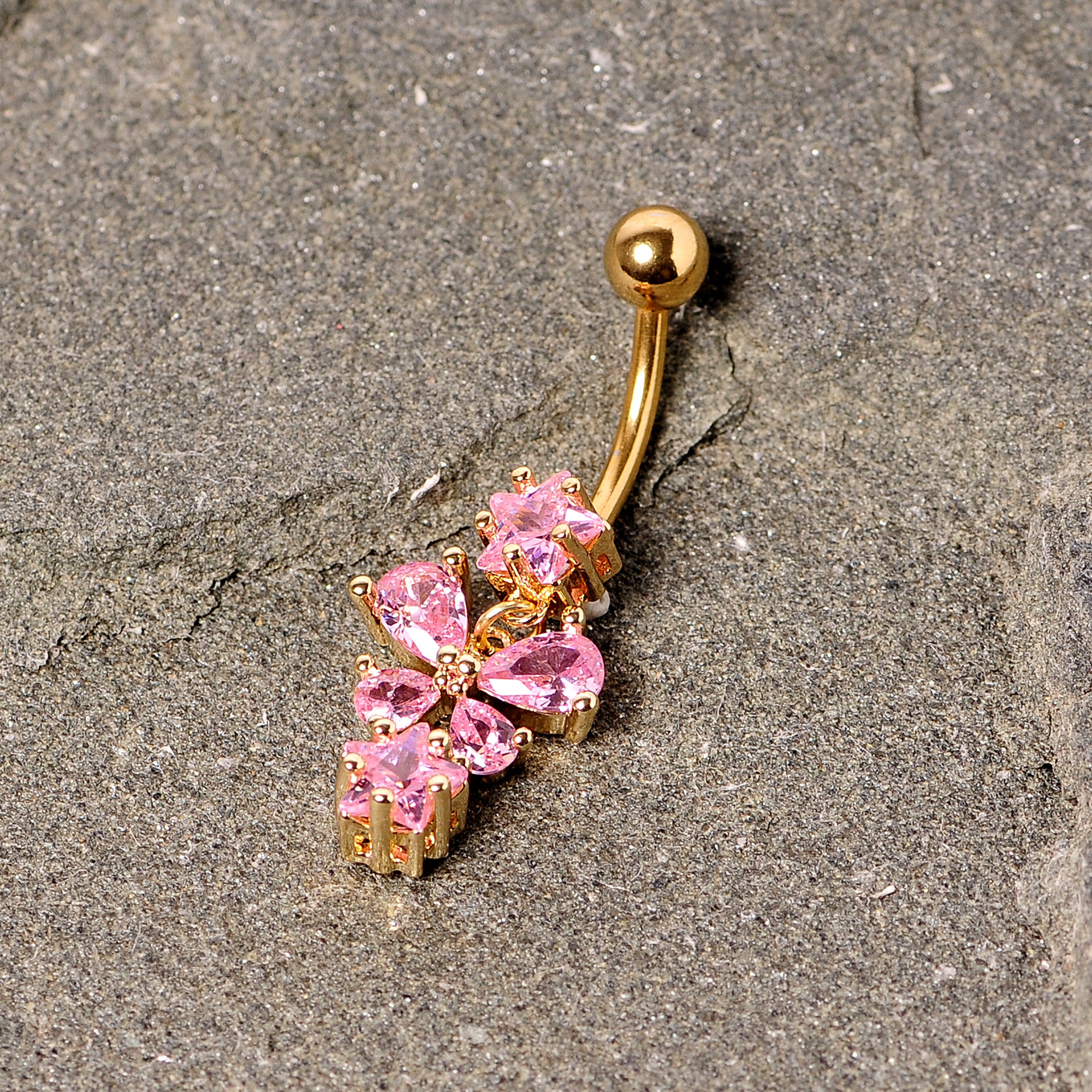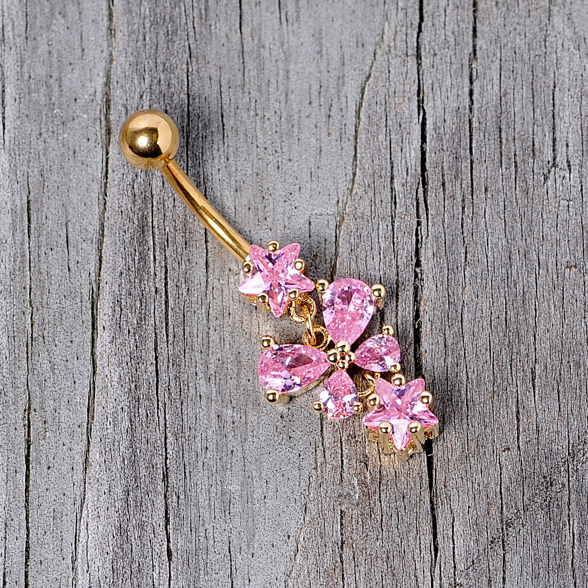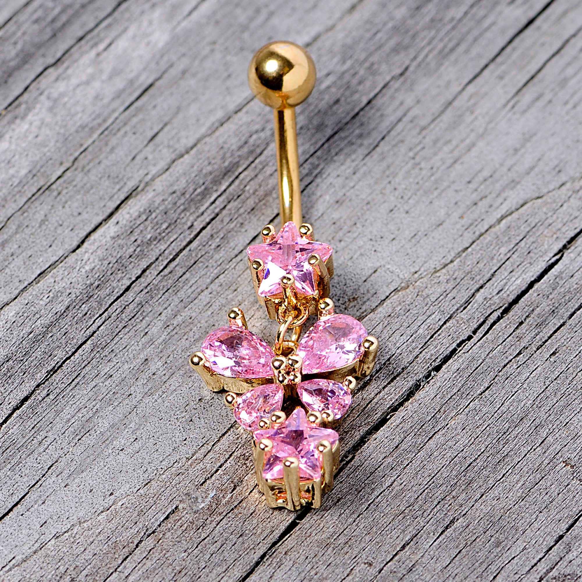 Pink Gem Gold Tone Star Bow Dangle Belly Ring