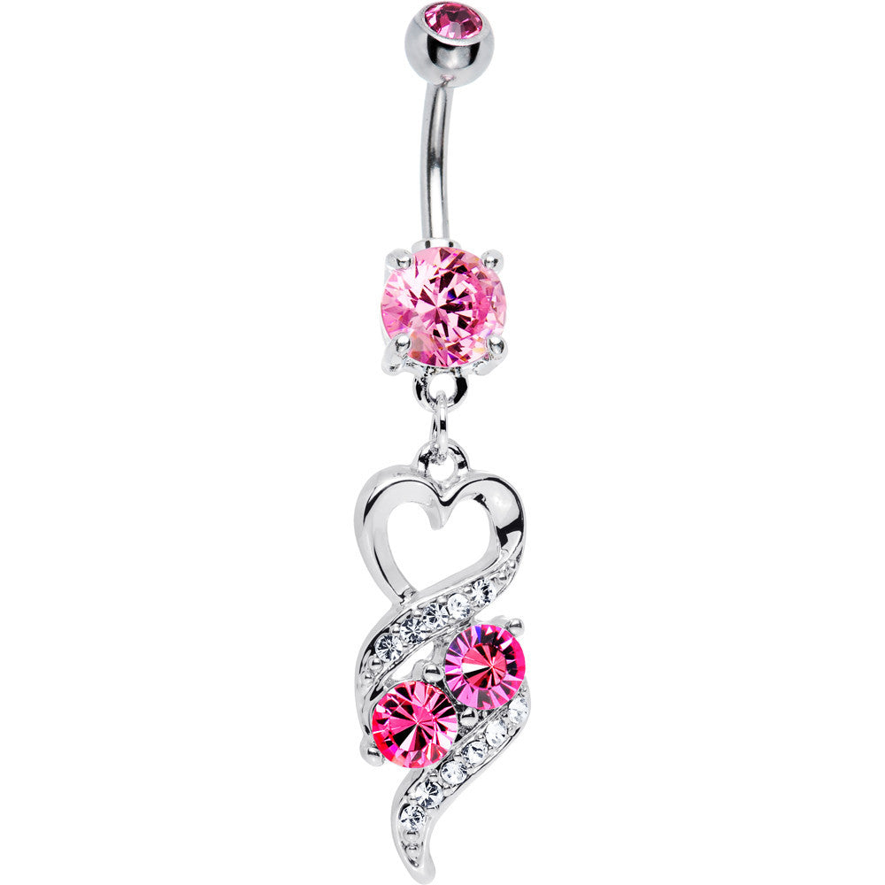 Feel the love flowing from this swirling heart belly ring. Crystal navel ring with heart and swirl dangle and sparkling pink gems. Double gem belly jewelry.