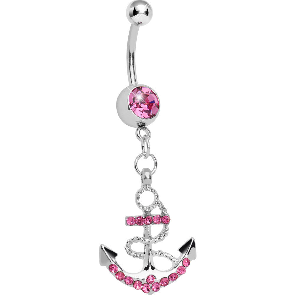 Ahoy ladies! Take on the high seas with this stunning pink gem encrusted anchor navel ring. Anchor charm dangles from a stainless steel curved barbell.