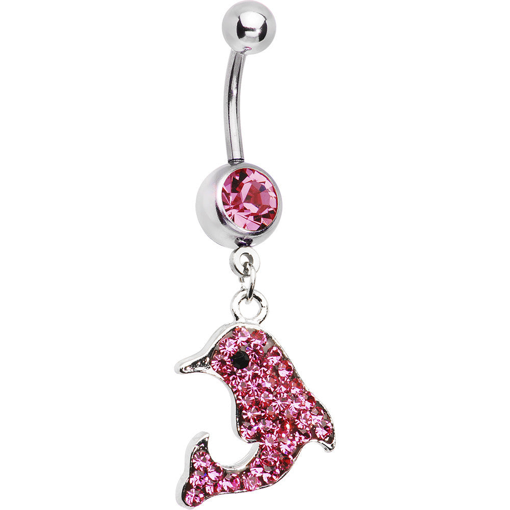 Pink Gem Paved Dolphin Dangle Belly Ring
