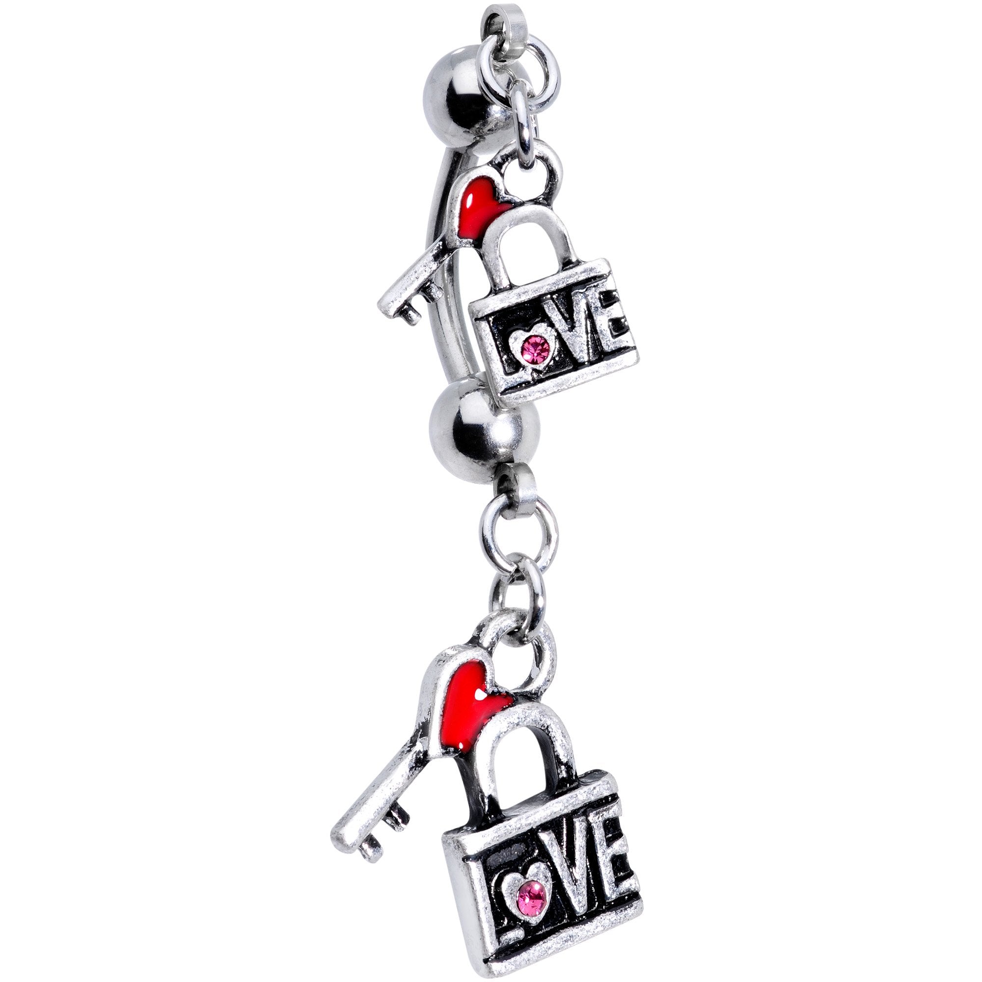 Unlock your love with this unique lock and key double mount dangle belly ring. Two miniature padlocks with the words "Love" written on them are decorated by cute pink mini gems and red heart--accented keys on this 14 gauge dangle belly ring. The dangle lock and key charms are mounted on a 3/8" curved barbell made with durable 316L surgical grade stainless steel.