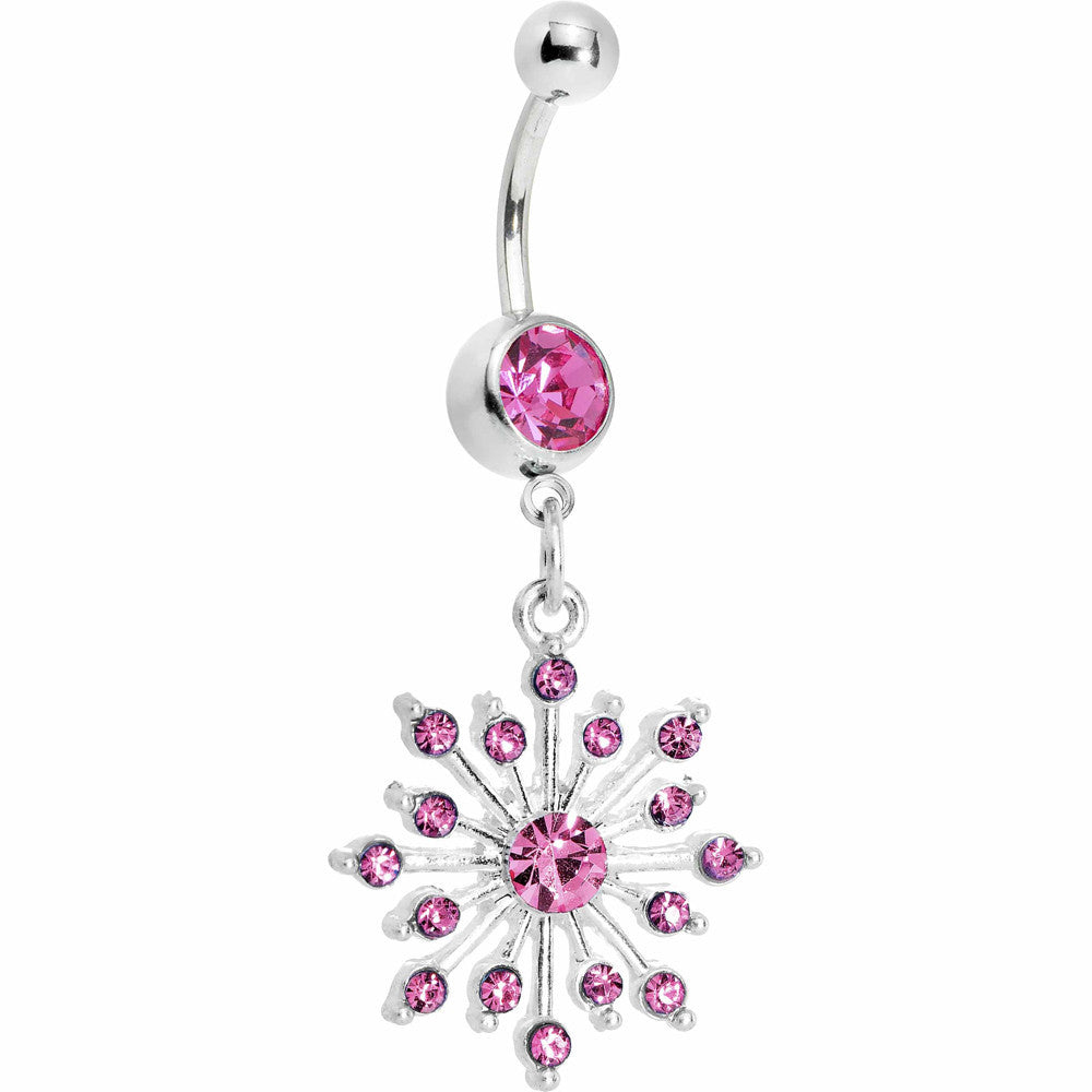 A host of shimmering gems makes this snowflake belly ring sparkle. Gem navel ring with delicate falling snowflake charm. Curved barbell belly jewelry.
