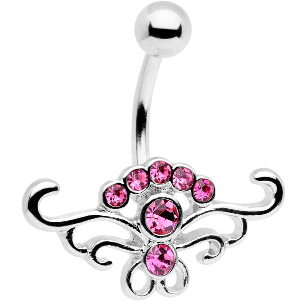 This breezy belly ring just begs to be the center of attention on those hot summer days! Featuring a cluster of sparkling pink gems mounted on a light and breezy filigree frame, this belly ring is made with a 7/16" in length curved barbell. The 14 gauge curved barbell is made with durable 316L surgical grade stainless steel. Add this perfect summer fashion item to your collection today.
