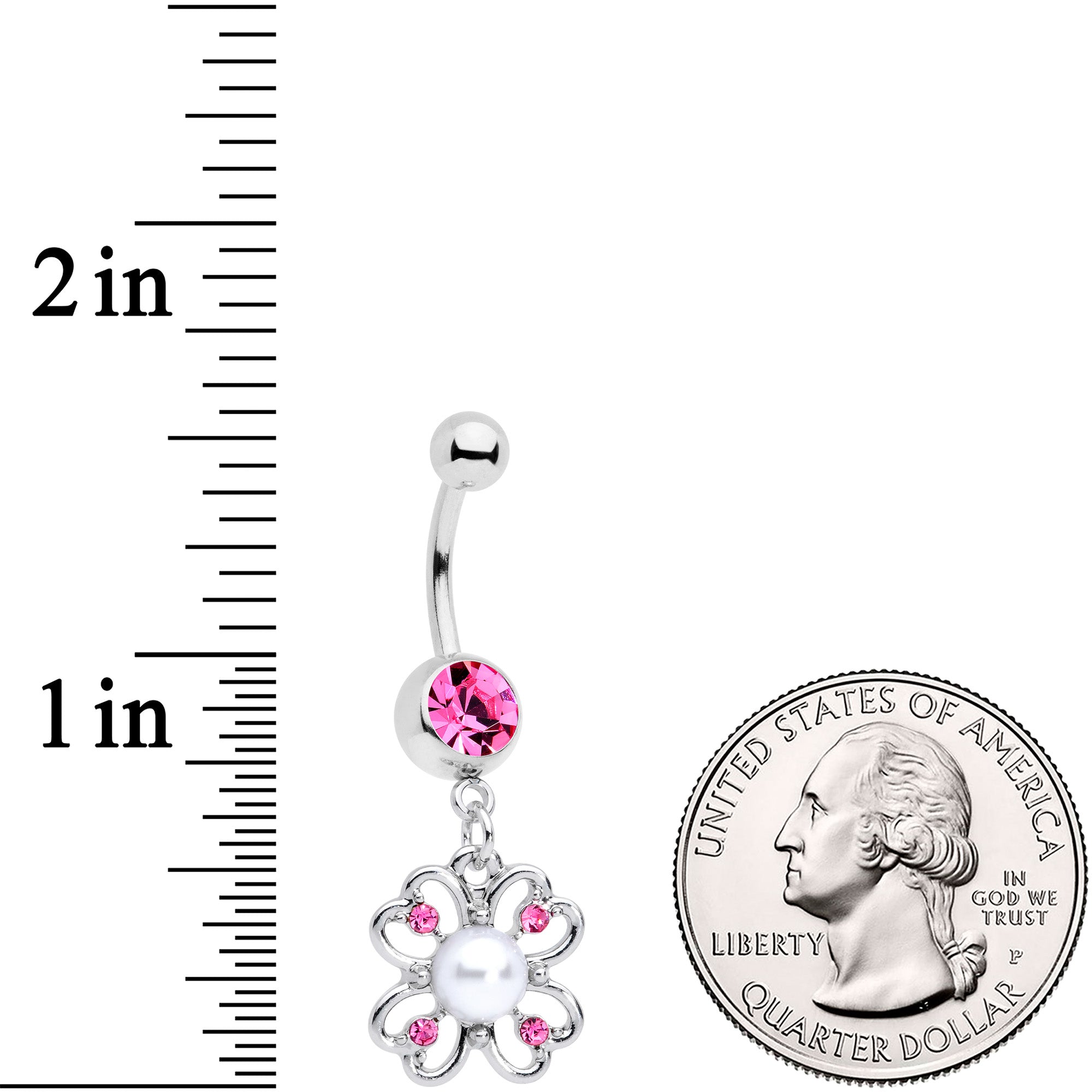This 14 gauge navel ring features a clover with class! It's made with a 3/8" durable 316L surgical grade stainless steel curved barbell with a 5mm top ball end. The bottom ball end is 8mm and set with a large pink gem. Dangling below it is a bubbled shamrock charm with a small pink gem set into each leaf. At the center is a large white pearlescent orb for an added feel of lavish luxury. If you want to celebrate your Irish heritage and give your navel the poshest piercing around, this clover has you covered!