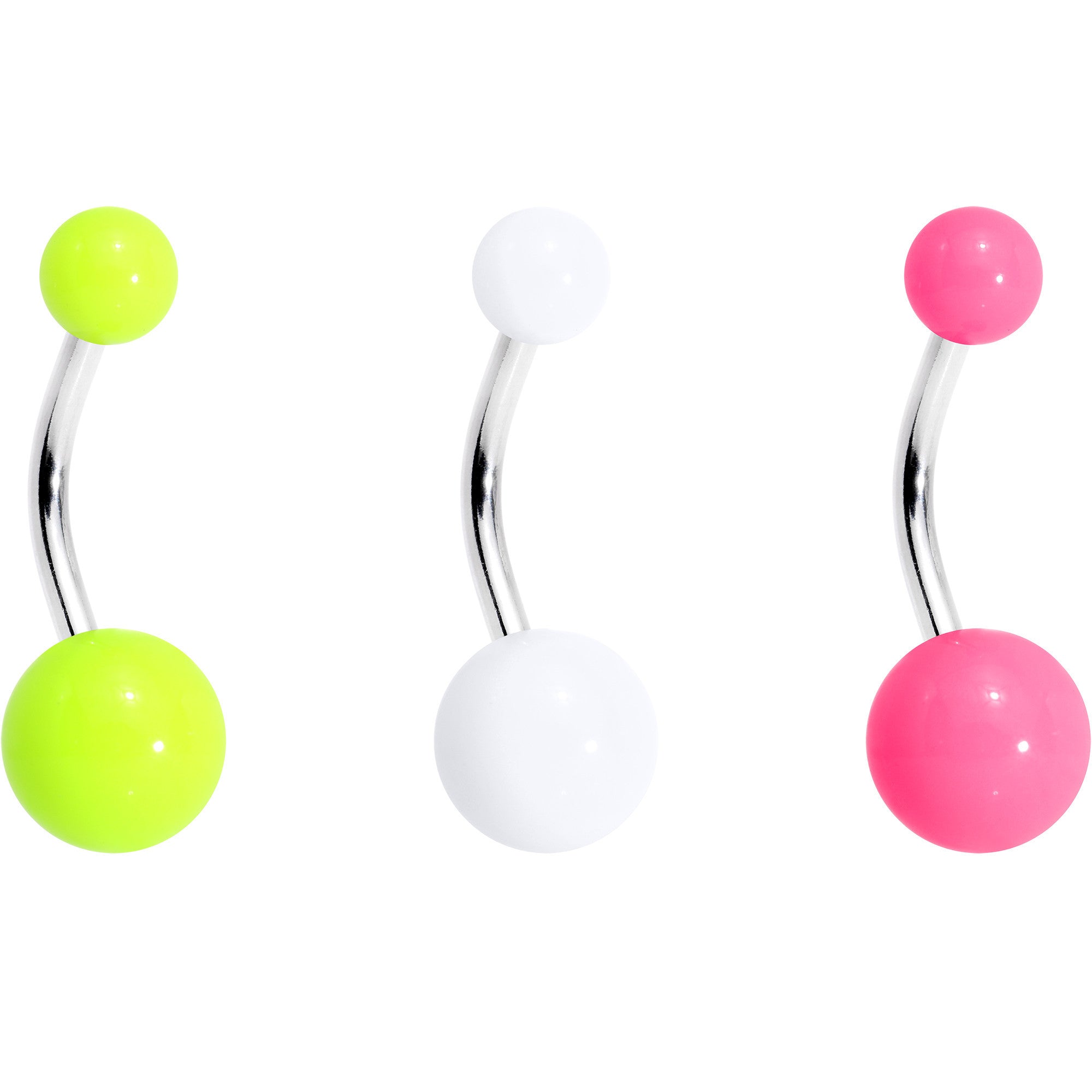 Poise yourself for the fun of alternating accessories when you wear this 14 gauge pack of five belly button rings. Made with 3/8" durable 316L surgical grade stainless steel curved barbells, this bonus pack of navel piercings features two pieces that feature bottom green or pink pastel orbs as well as three pieces that feature acrylic top and bottom balls in pink, yellow, and white. This bonus navel jewelry set will show the world you are passionate about colorful fashion and your navel jewelry collection!