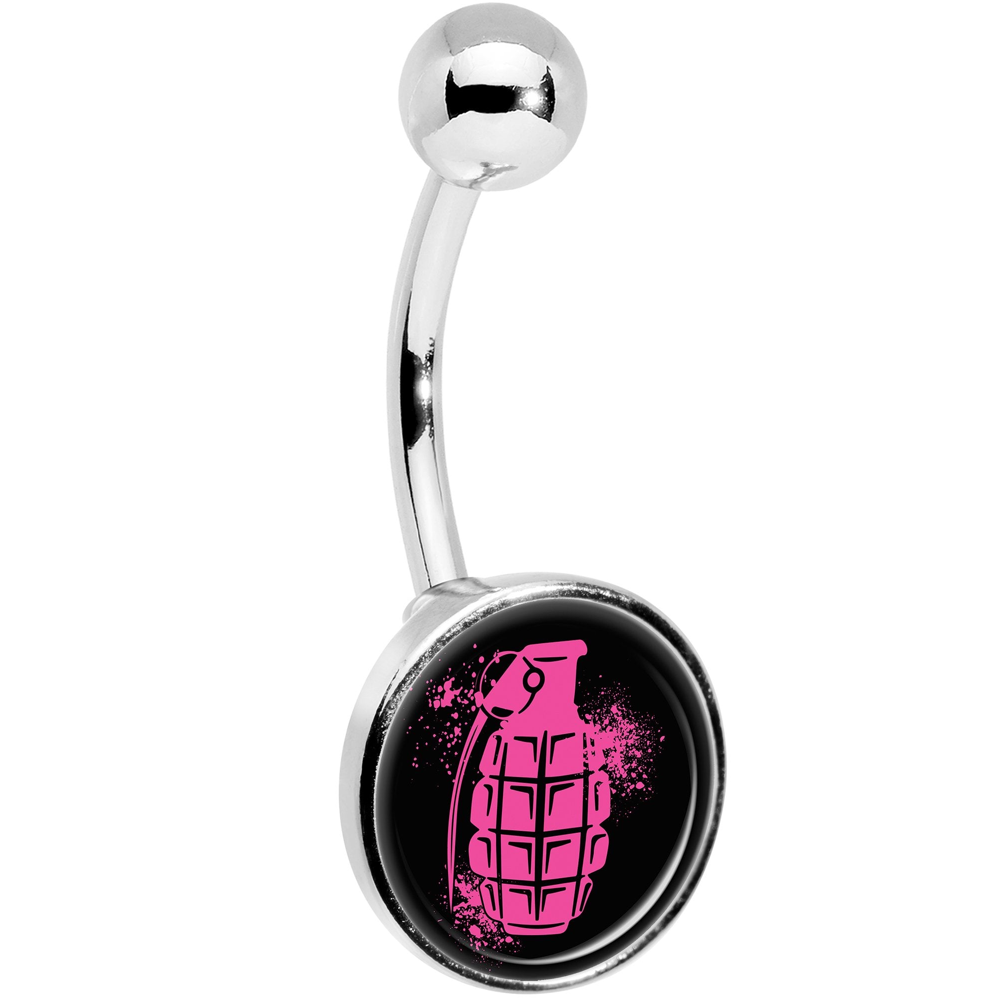 If you love the color pink and pop culture images like grenades then this 14 gauge belly button ring is right for you! Made with a 7/16" durable 316L surgical grade stainless steel curved barbell, this navel ring features a logo inlay bottom charm.