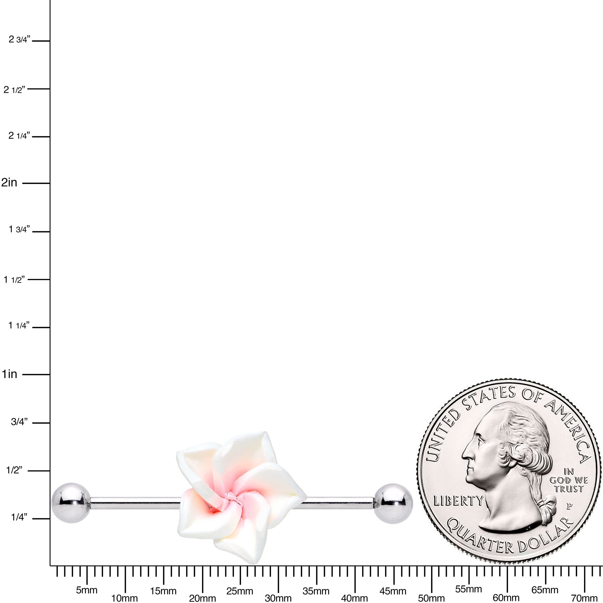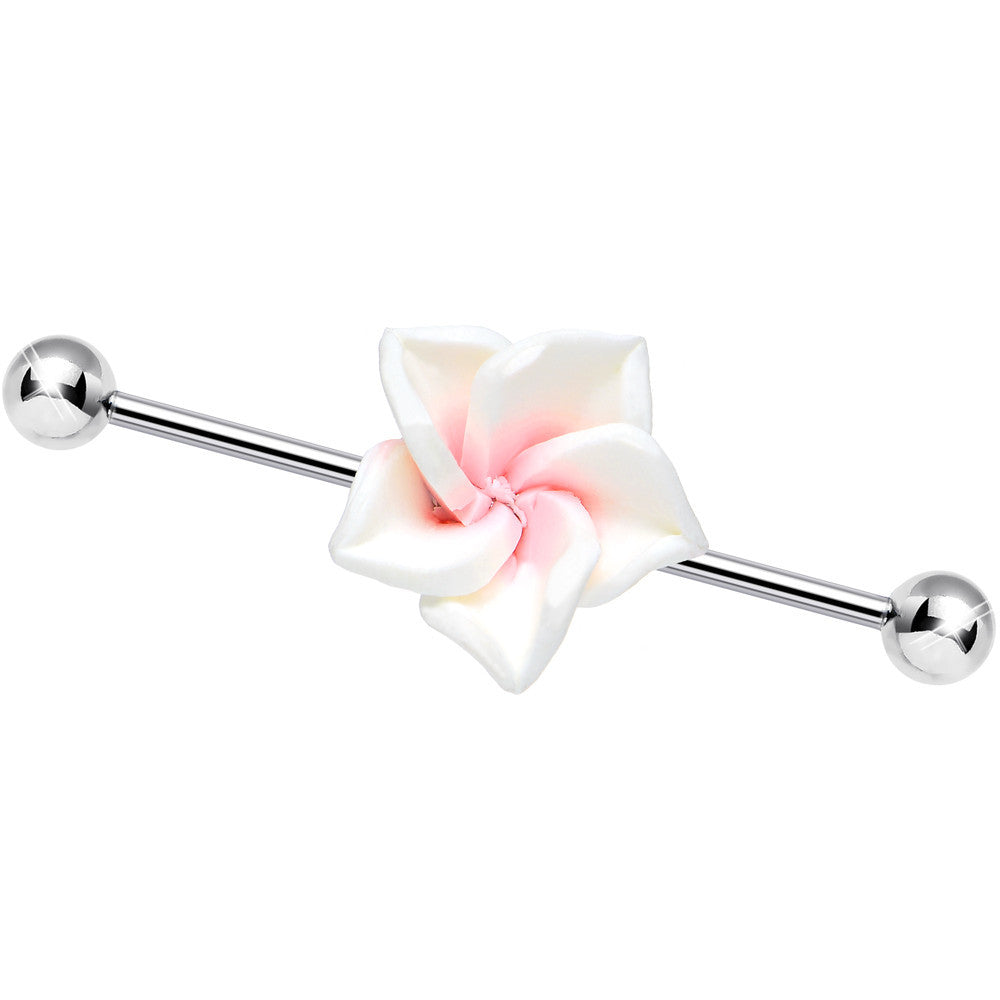 This flowering industrial barbell evokes the beauty of a summer garden all year long. The pretty white and pink flower - not unlike that of a southern magnolia - adorns a 14 gauge, 37mm stainless steel straight barbell. Flower themed helix project bars work for multiple piercings.