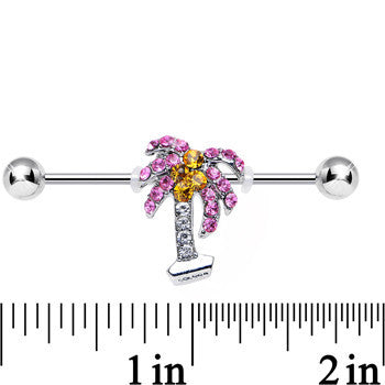 Feel the sand in your toes and the ocean breezes with this summer lover's palm tree industrial piercing. The 14 gauge, 36mm stainless steel industrial barbell features a pink and clear gem palm tree, complete with yellow gem coconuts. Tropical themed project bar body jewelry works for multiple piercings and comes with two rubber O-rings to hold charm in place.