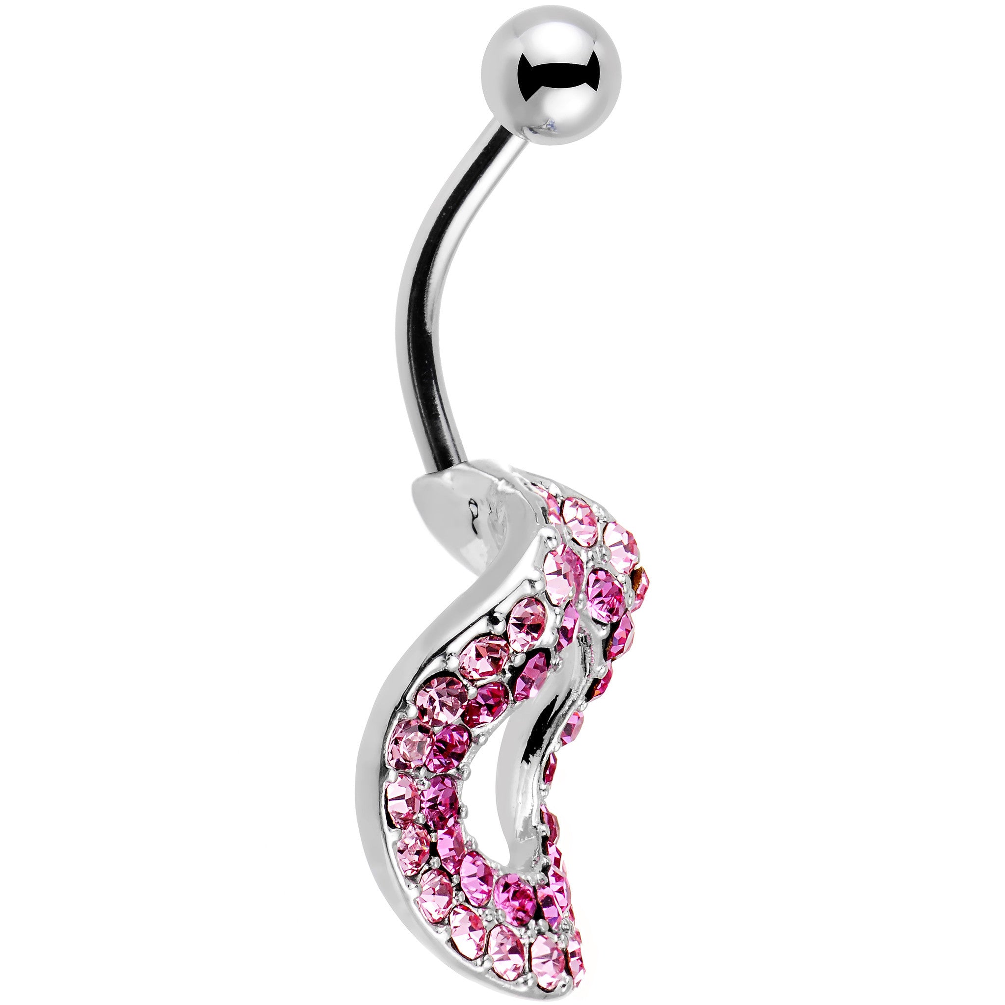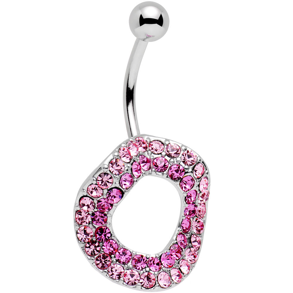 Hypoallergenic jewelry for sensitive skinGo ahead and act a little warped when you wear this unique navel piercing. This belly button ring is made with a surgical grade stainless steel curved barbell and features a wavy, curving ring of pink gems that will add asymmetric style to your navel jewelry collection.