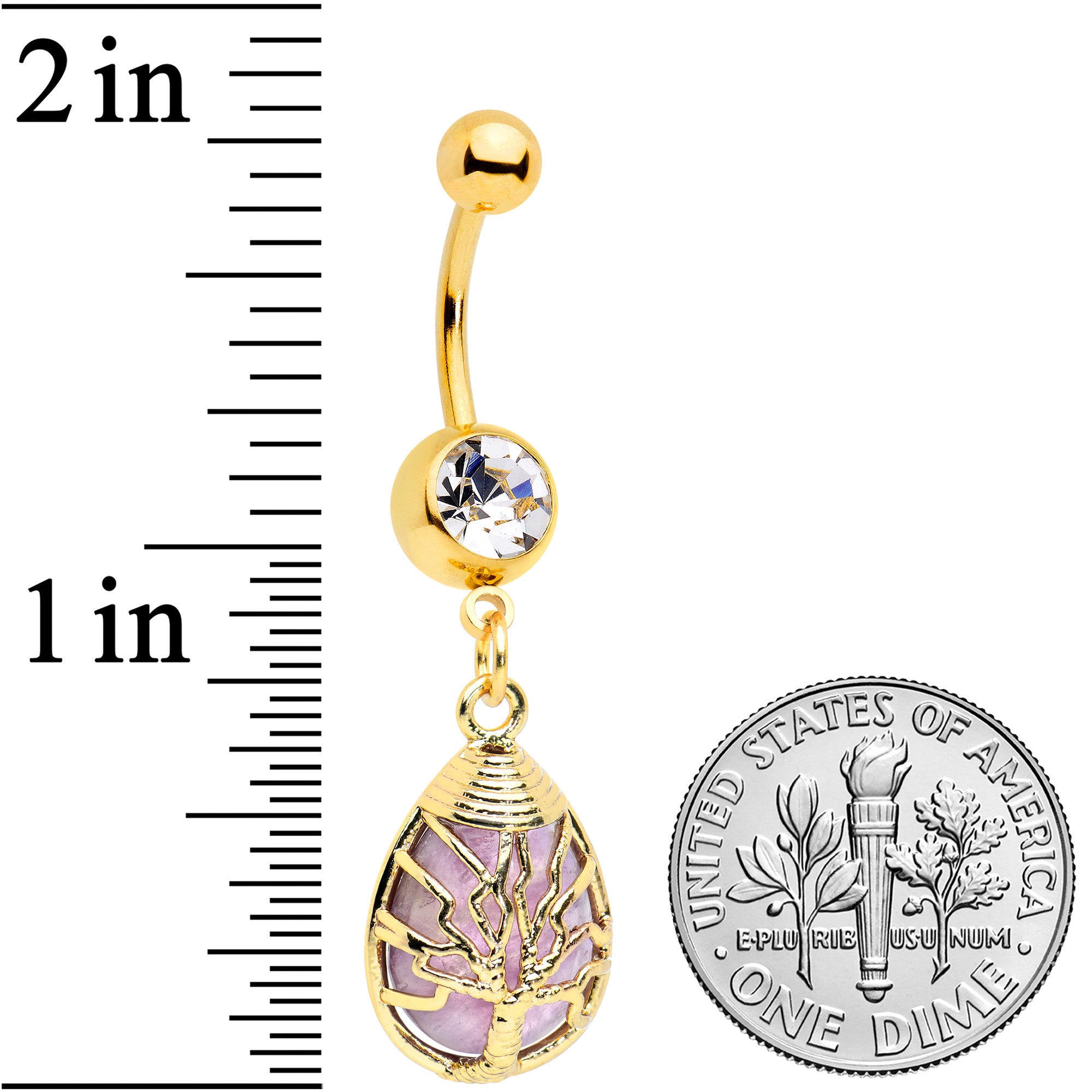 For Arbor Day or any day, get your tree on with this 14 gauge navel ring! It's made with a 3/8" gold tone PVD over 316L surgical grade stainless steel curved barbell with a 5mm top ball end. The bottom ball end is 8mm and set with a large clear gem. Dangling beneath it is a purple amethyst drop. Wrapped around it is a tree charm, for a look that has both depth and style. Let your look branch out into some elegant, arboreal style with this tree-themed belly piercing jewelry!