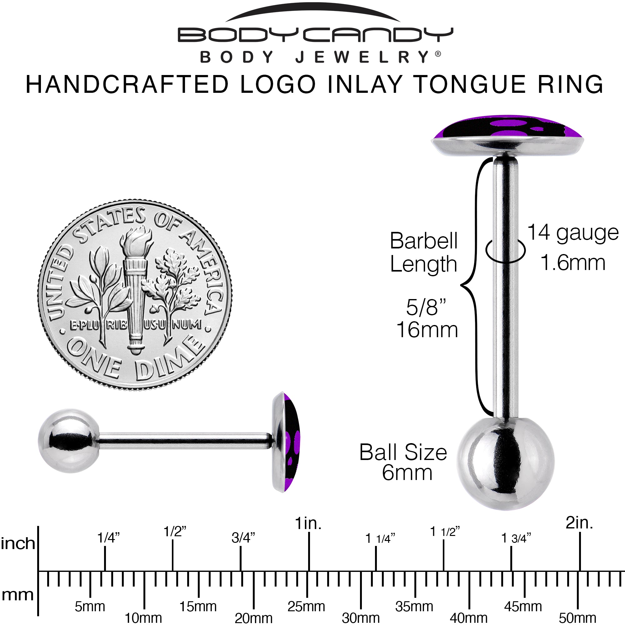 Get a look that will strike 'em dead with this 14 gauge tongue ring. It's made with a 5/8 inch 316L surgical grade stainless steel straight barbell with a 6mm bottom ball end. The top end features a simple silhouette of a black skull on a purple background. You'll totally knock 'em dead with this gothic skull tongue piercing jewelry.