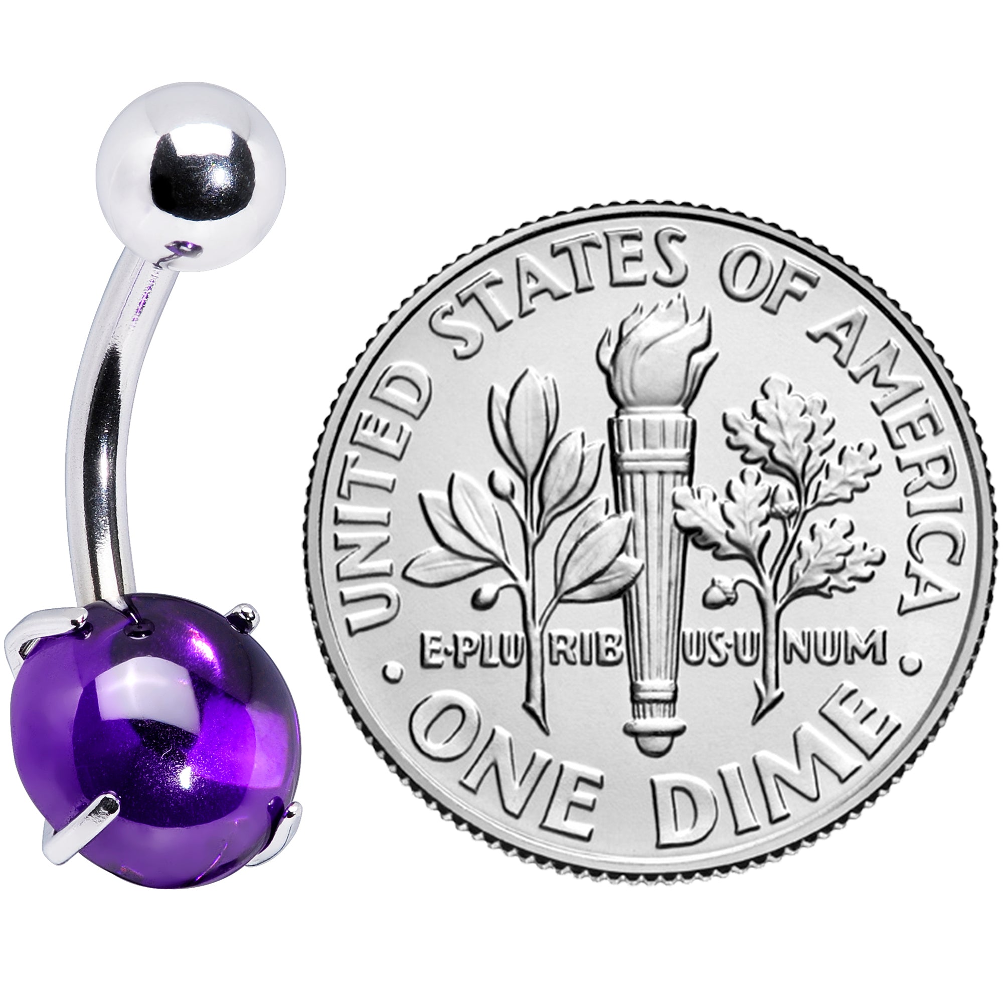 Feeling backed into a corner by the lack of options for your navel piercing? This 14 gauge belly button ring has a way to get around that! It's made with a 3/8" durable 316L surgical grade stainless steel curved barbell with a 5mm top ball end. The 8mm bottom end is a smooth rounded half-sphere of purple cubic zirconia. It brings a striking pop of color to your piercing, while giving it an elegantly understated appearance. This navel ring is all grown up but still ready to show off a little. If you're looking for something refined but still contemporary, let this belly ring take the edge off!
